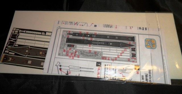 В упаковке 230/100мм поместилась небольшая инструкция и плата с травленкой размером 150/52мм из не сильно тонкого желтого металла. По крайней мере вертлюги тоже этой фирмы сделаны на более тонкой пластине. Это даже очень хорошо, т.к. установка палубы на модель будет занятием не для слабонервных.