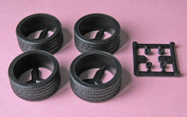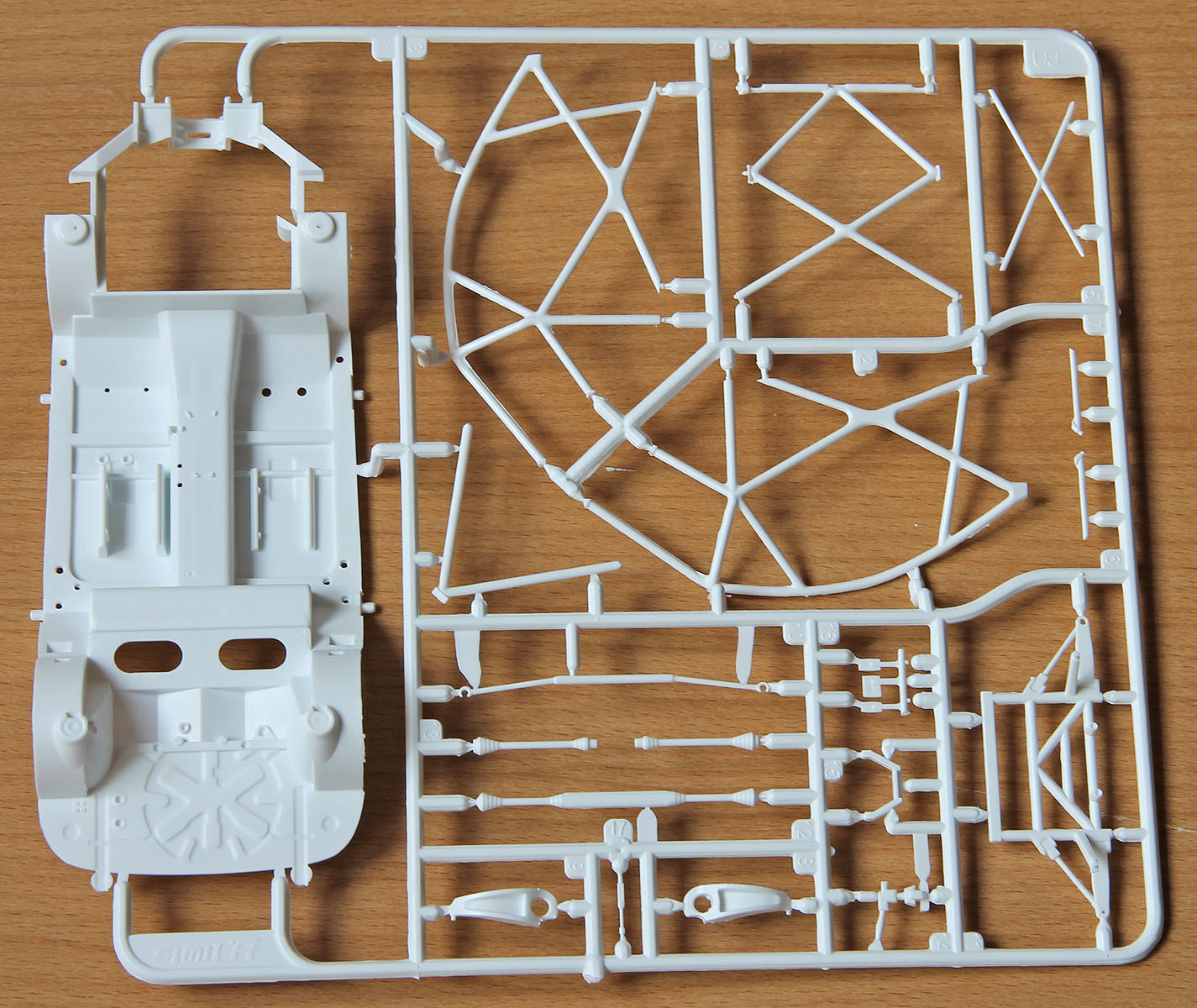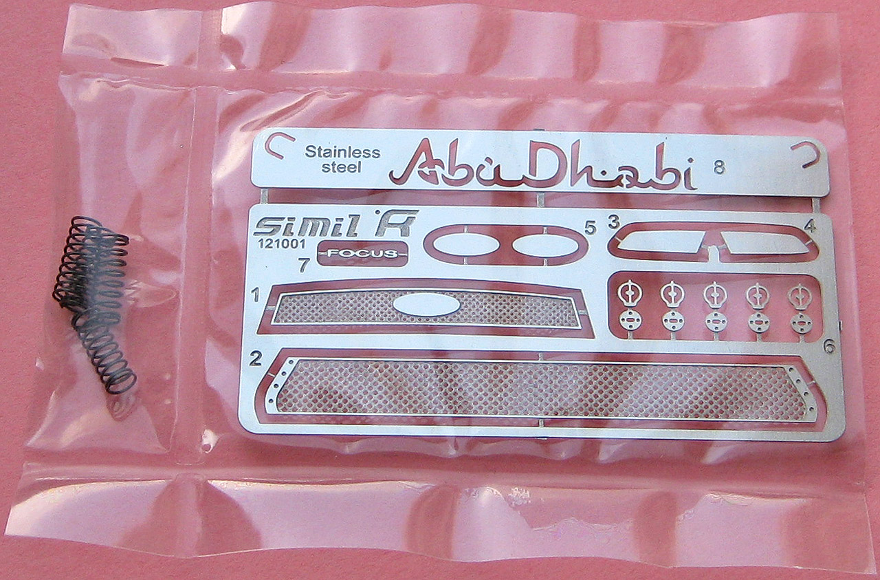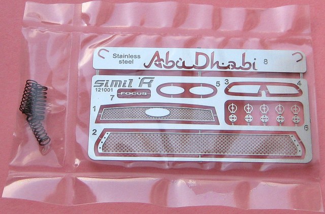 Все литники запечатаны в отдельные пакетики и представляют из себя 3 рамки отлитых из белого пластика, 1 из прозрачного и 1 маленькую рамку из черного пластика. Шины выполнены из мягкой резины. Присутствует небольшая плата фототравления, в которой имеется даже маска для надувания логотипа AbuDhabi на одну из решеток. В пакетике вместе с платой вложены 4 пружинки, которые исользуются в подвеске, а в пакетике с декалью вложен лист с масками для стекол.