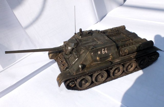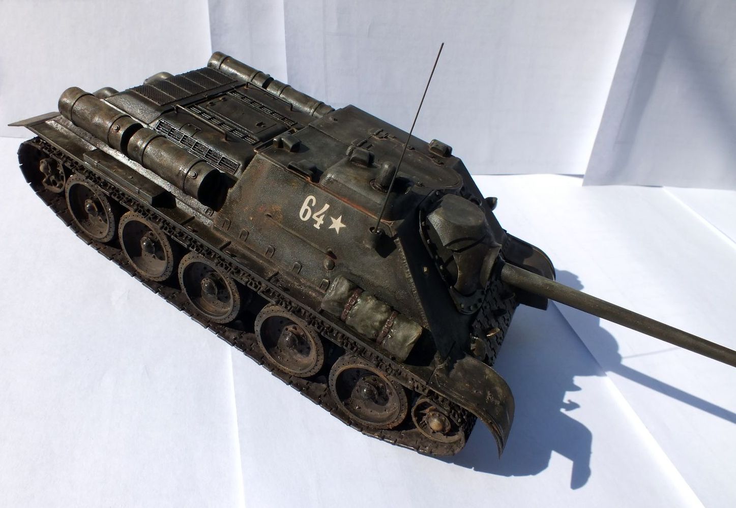 Доброго времени суток,уважаемые Каропчане. Получил в подарок на прошлый ДР известный набор для сборки истребителя танков СУ-85 от Тамии. Долго не решался взяться, и вот наконец собрался. Так как времени свободного было совсем немного, то получилось что-то вроде экспресс стройки. Конечно же это чистая изкаробка. Никаких исторических привязок. Единственное что доработал – установил точеный ствол (чьего производства - просто не помню). При сборке проблем не было. Единственное, что вызвало печаль – совсем уж убогие виниловые гуси, но менять на что-то более серьезное для такой стройки посчитал излишним. Переборщил с обгадингом. Красил Тамиевским акрилом, смывка - масло на Уайт-спирите, пигменты Акан, MiG и собственно входившая в набор тамиевская пудреница. Бейте-ругайтеJ