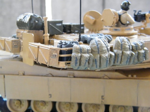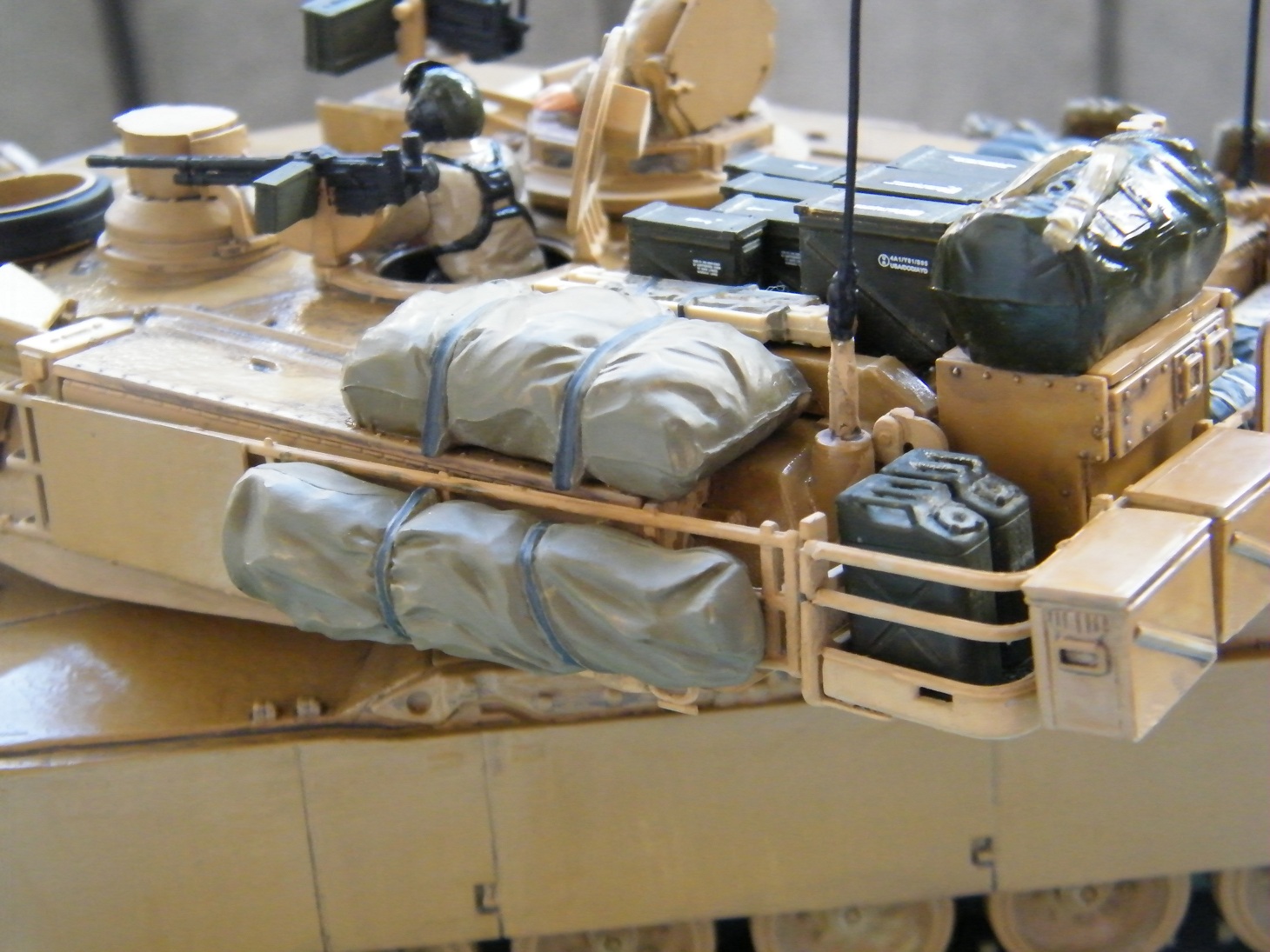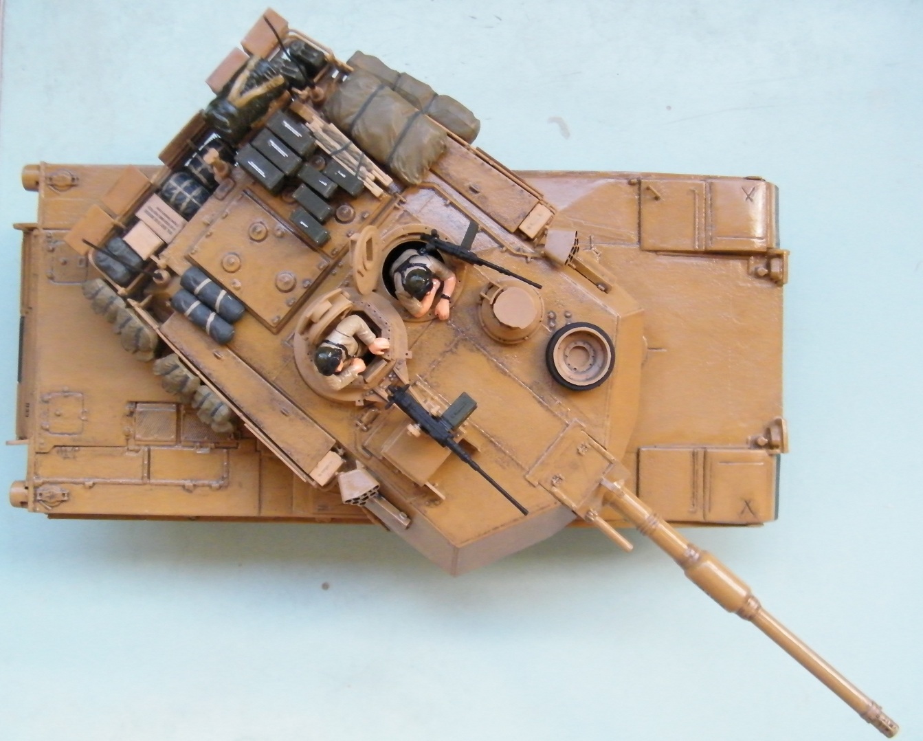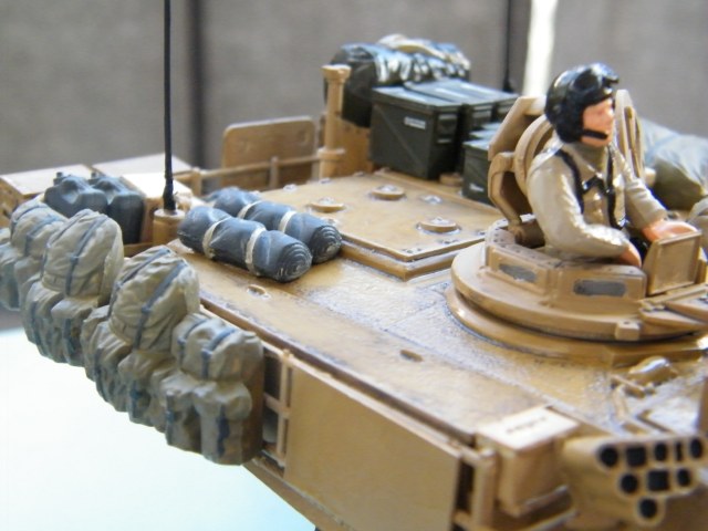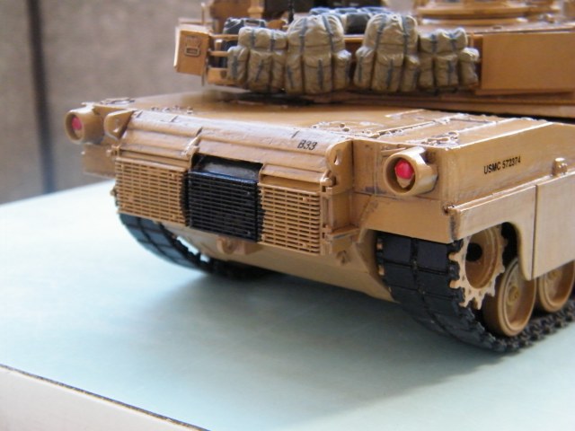 Вижу, что удален с кормы APU, оранжевый маяк и элементы MILES. Зашпаклеван след толкателя на заслонке прицела, танк перекрашен в песчаный камо. Это гуд. Деки использовались морпеховские, скорее всего, из-за того что армейские были применены до этого.