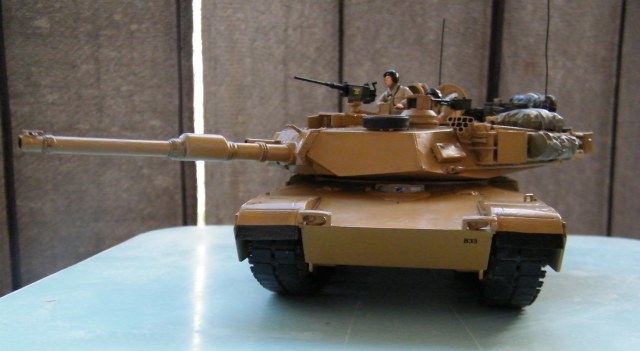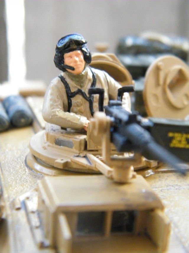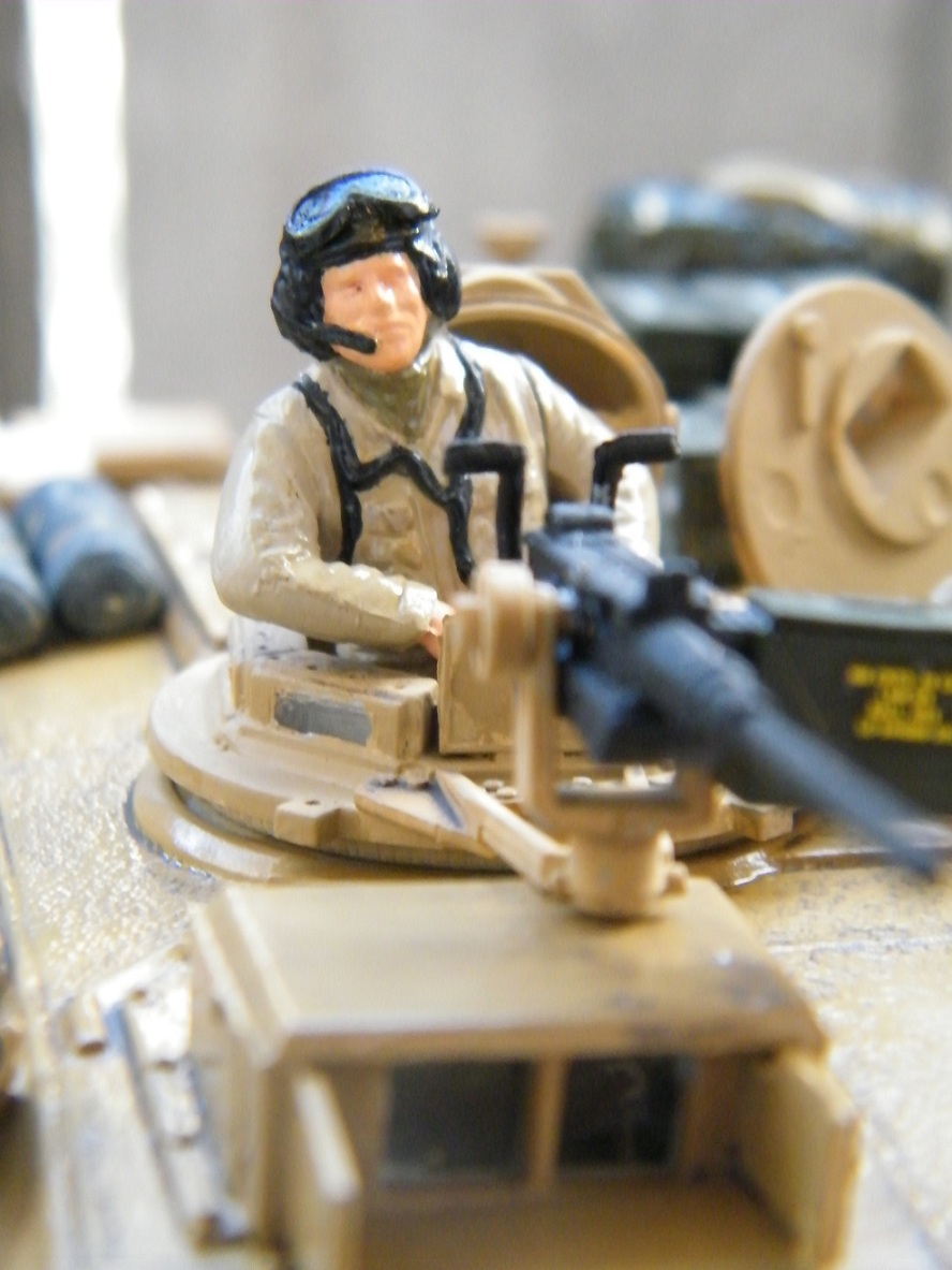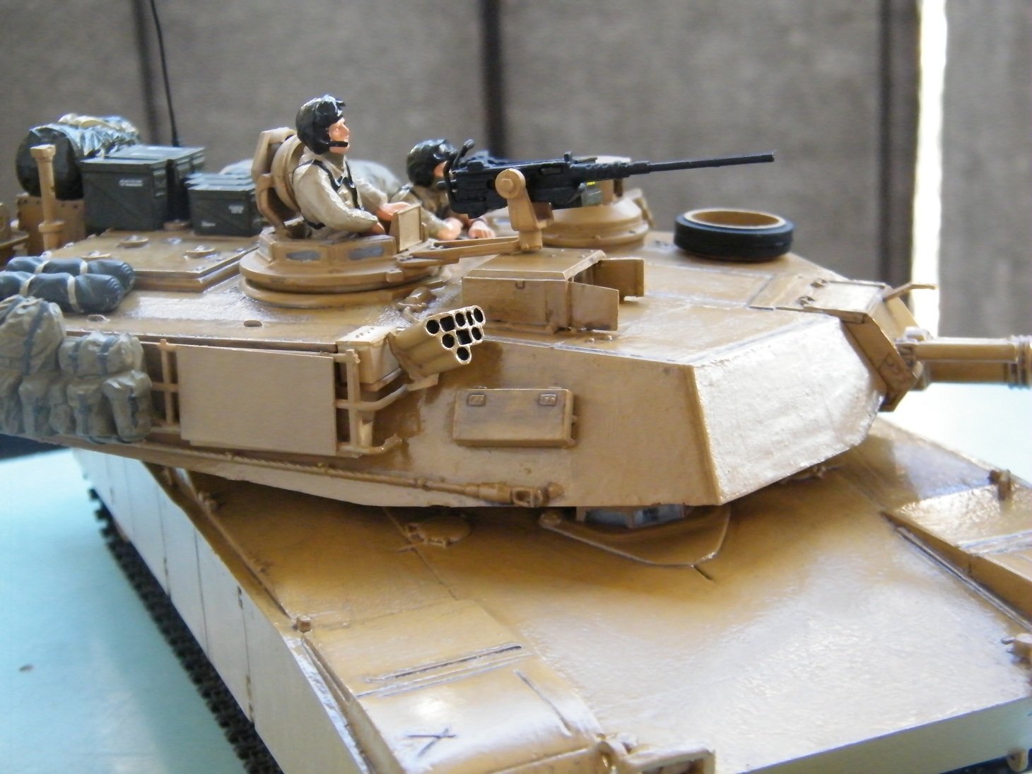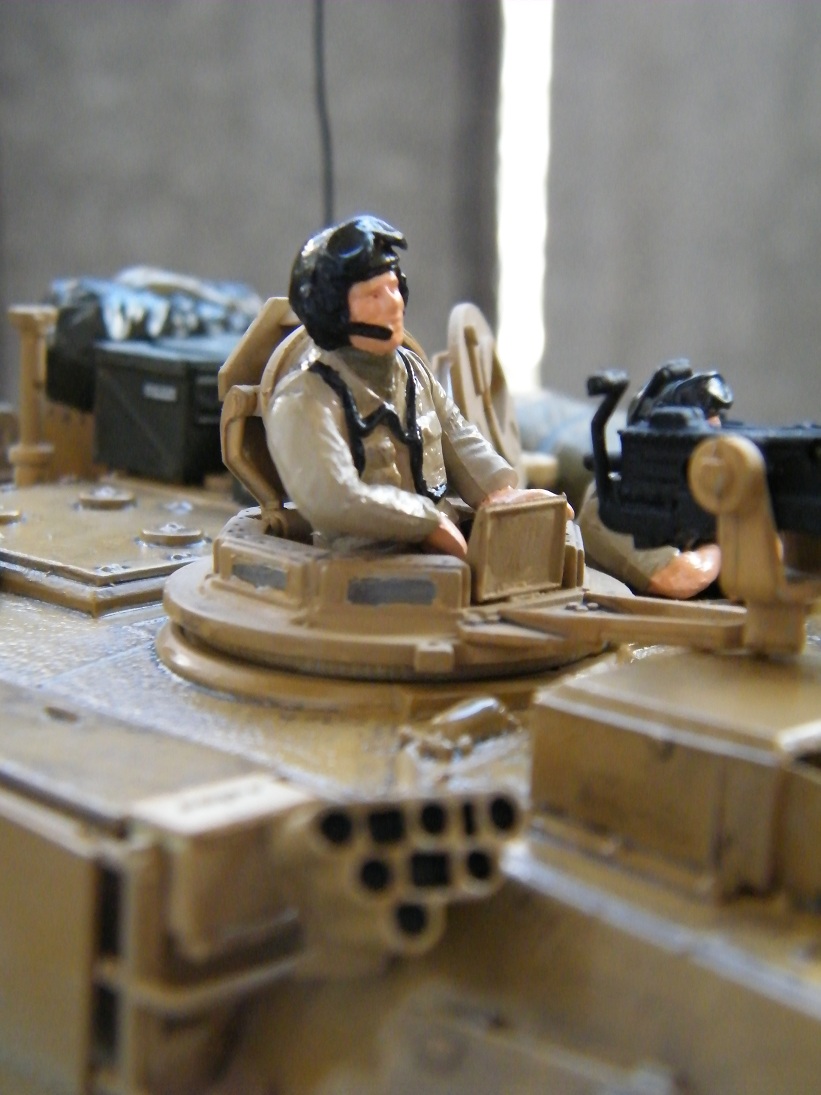 Вижу, что удален с кормы APU, оранжевый маяк и элементы MILES. Зашпаклеван след толкателя на заслонке прицела, танк перекрашен в песчаный камо. Это гуд. Деки использовались морпеховские, скорее всего, из-за того что армейские были применены до этого.