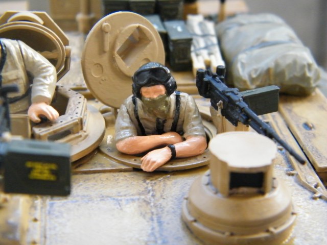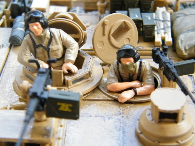 Теперь не гуд. Бандажи так и остались непокрашенными, а я про них писал. Остались следы толкателей на внутренних сторонах люков, швы на барахле, пулеметах и прочих мелких деталях. Кстати, барахло надо бы размещать по логике и продумывать способы его крепления. Вот тот баул, который на АПУ-шнике лежит, точно свалится при движении, потому как не закреплен никак. Стволы пулеметов надо высверливать, фары делать прозрачными. Перед сборкой изучить фотографии реальной машины, чтобы понять, какого цвета на самом деле должна быть оптика. С гусеницами тоже надо потрудиться, они ж не целиком резиновые на самом деле. Красить надо поаккуратней. Роспись фигурок, это вообще отдельный разговор. Поэтому предложение - экипаж дембельнуть, люки закрыть))). Танк дальнейшим переделкам не подвергать, а оставить в роли "кошки" для отработки технологий.
