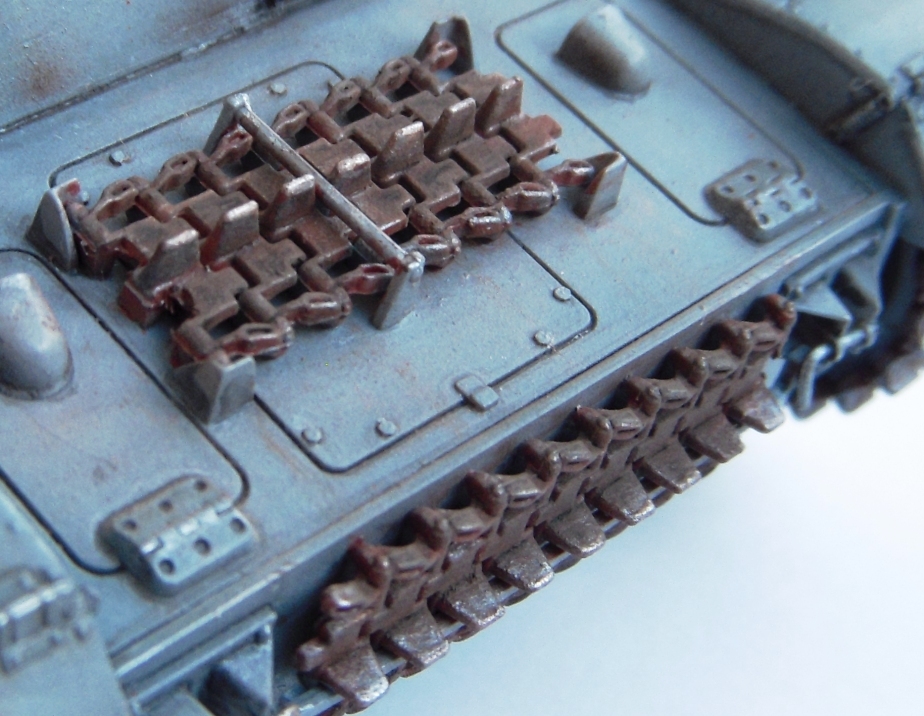 если предположить, что гусеницы грязные, а не ржавые, то все равно запасные траки спереди хорошенько поржавели до уровня бурой ржавчины, глушитель же или светлее или так же, хотя глушитель под нагревом должен был поржаветь темнее, а тут он блестяще рыжий.