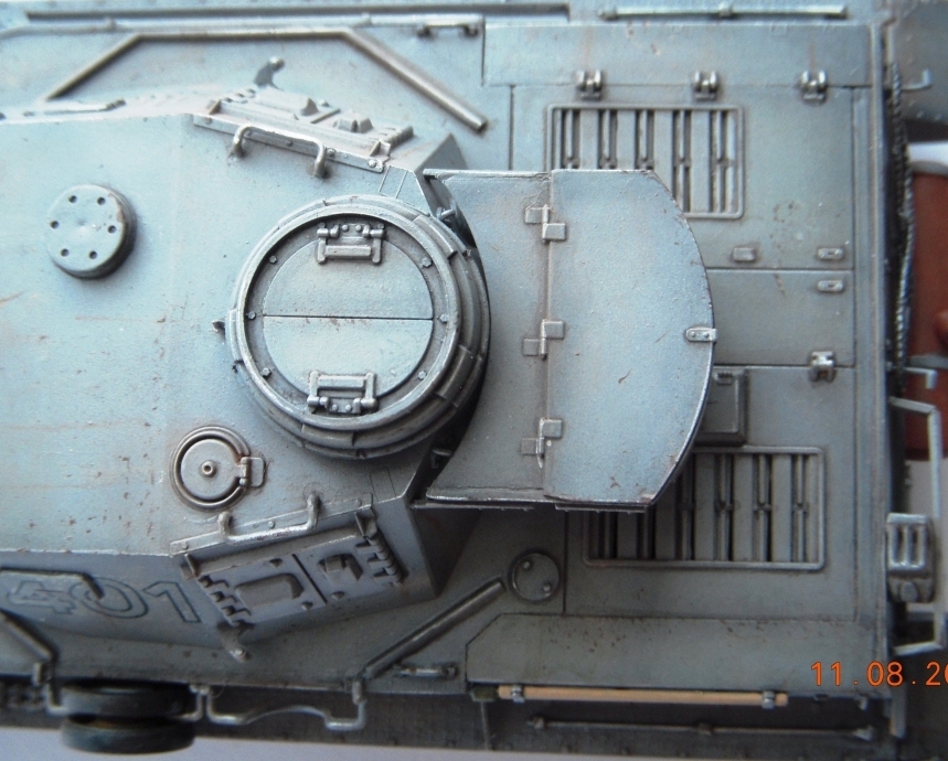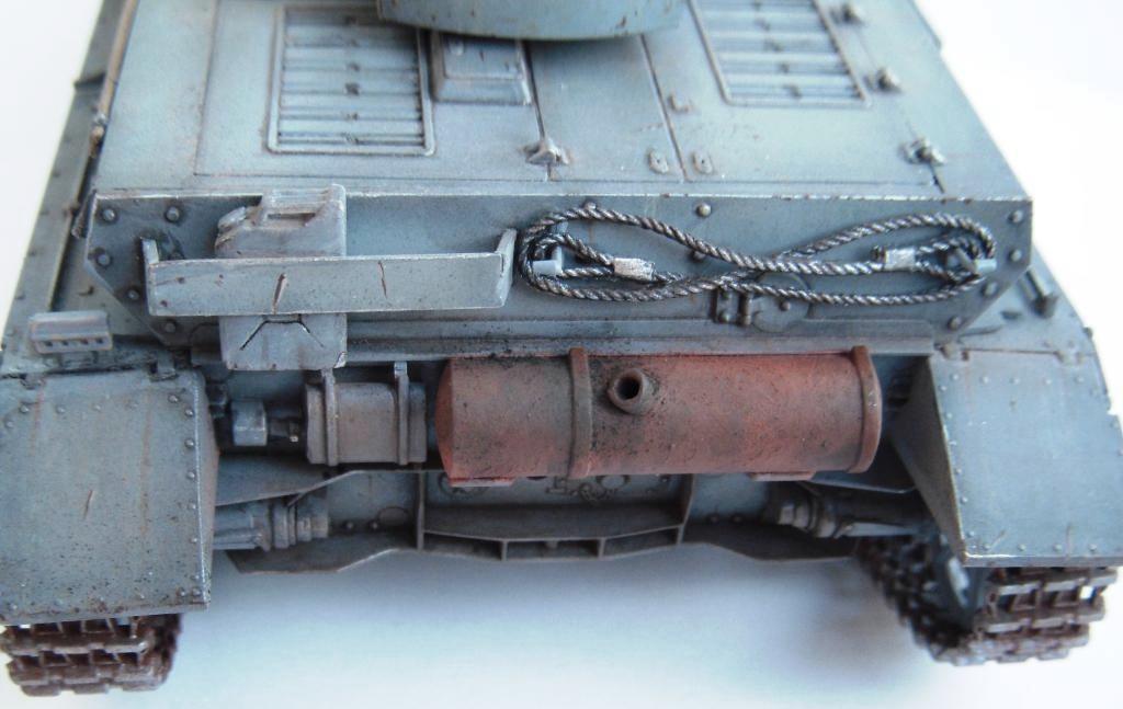 заднюю стенку башни не исправили, утяжины на бронировках башенного вентилятора и вентиляции тормозов не заделали, следы толкателей около механизмов натяжения гусениц тоже, про брусок сказали, основной глушитель подкоптить, да и хомуты заржавить, глушитель поворота башни заржавить, ком.башенку не исправили(подвижные бронировки), пулемет радиста должен сильнее торчать...