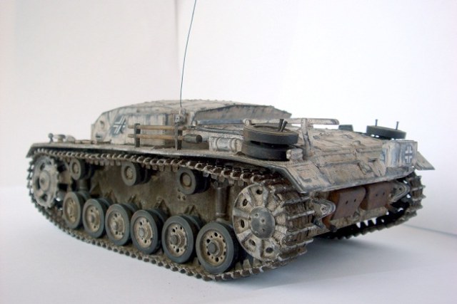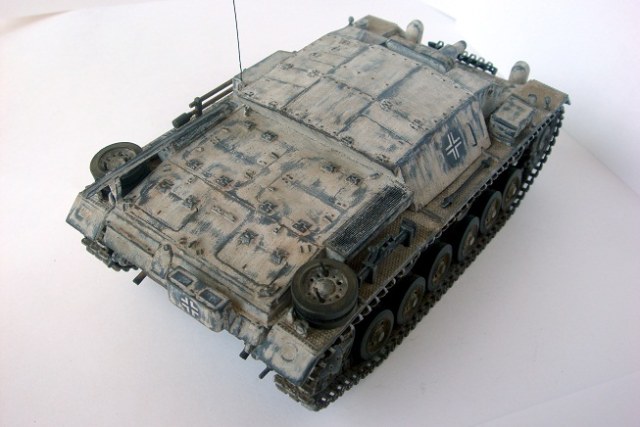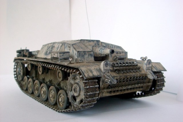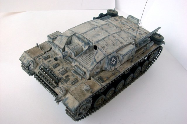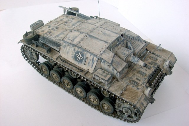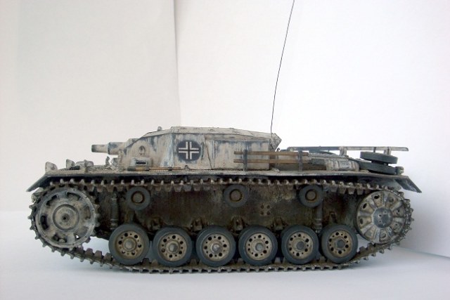 Приветствую, уважаемые коллеги. Хочу представить на Ваш суд небольшую реставрацию модели немецкой самоходки Stug III Ausf. B от фирмы «Звезда»в масштабе 1:35. Модель была собрана пару-тройку лет назад и оформлена на лето 1941 г. В связи с пересмотром представлений о окрасе техники решил немного ее освежить. Снял старую краску и маркировку, поставил травленые решетки на МТО, добавил антенну, фары от «Elf», запасные траки от «Dragon» и постарался изобразить полустершийся зимний камуфляж. Вот, собственно, и все. Результаты на фото. Буду рад отзывам коллег!