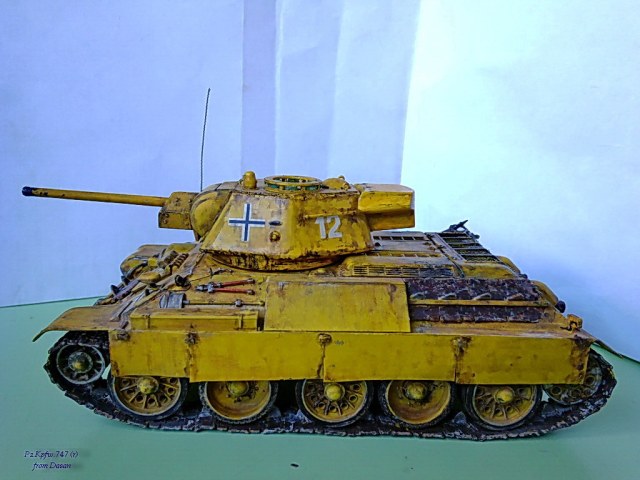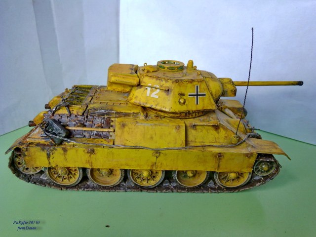 Панцерваффе охотно использовали взятые в качестве трофея Т-34 различных модификаций. И, в свою очередь, часто модифицировали русские танки с целью улучшения их боевых качеств. В марте 1943 года в Харькове на ХПЗ танкоремонтное подразделение дивизии СС "Райх" организовалопереоборудование примерно 70 трофейных Т-34, причем замена поврежденных деталей сопровождалась добавлением элементов от немецких танков и установкой экранов.Переоборудованные Т-34 были переданы 2-му танковому корпусу СС (в "Райх" и "Тотенкопф"). Я представляю вашему вниманию модель Т-34 танковой дивизии СС "Тотенкопф" периода весны 1943 года.