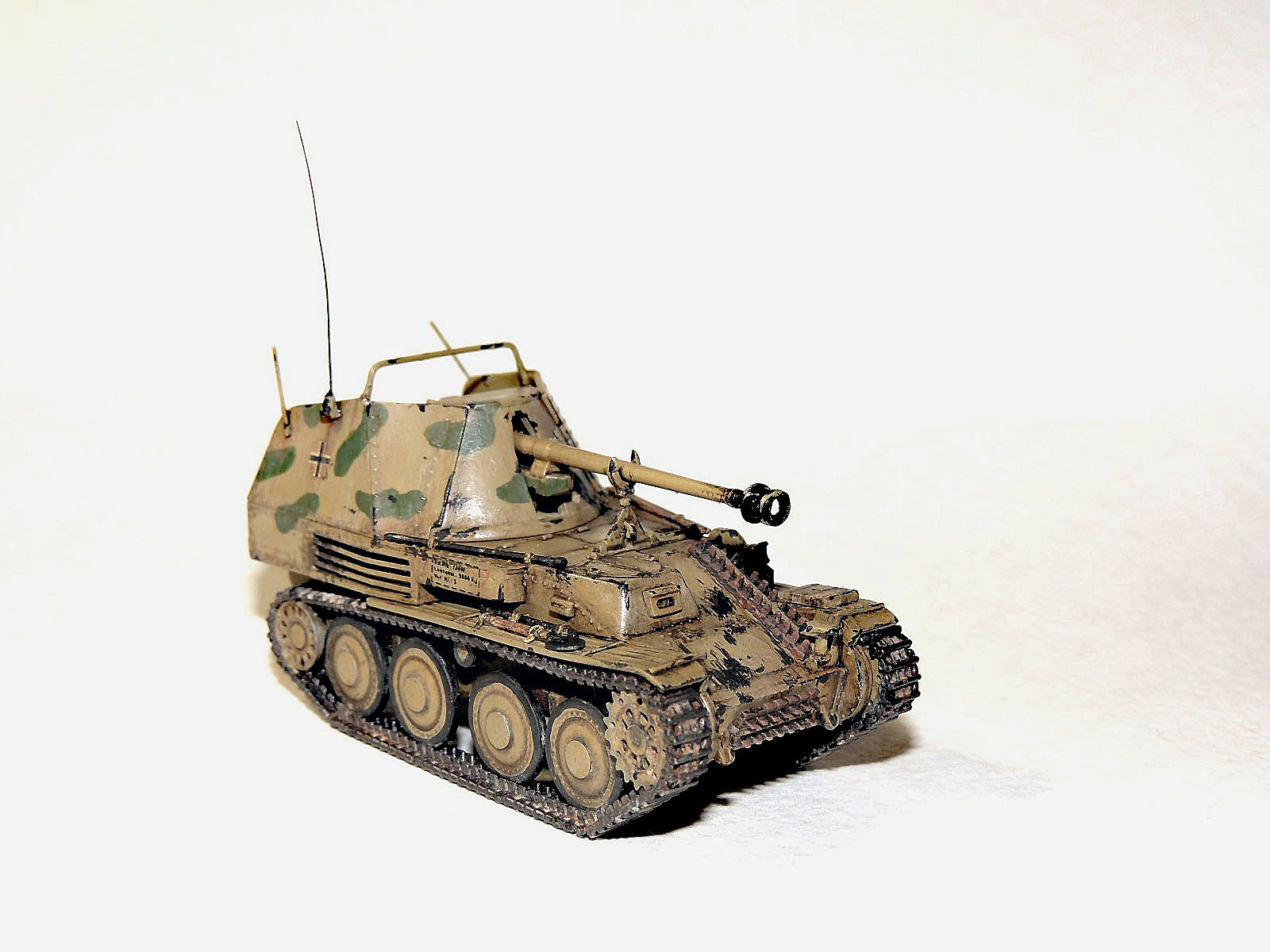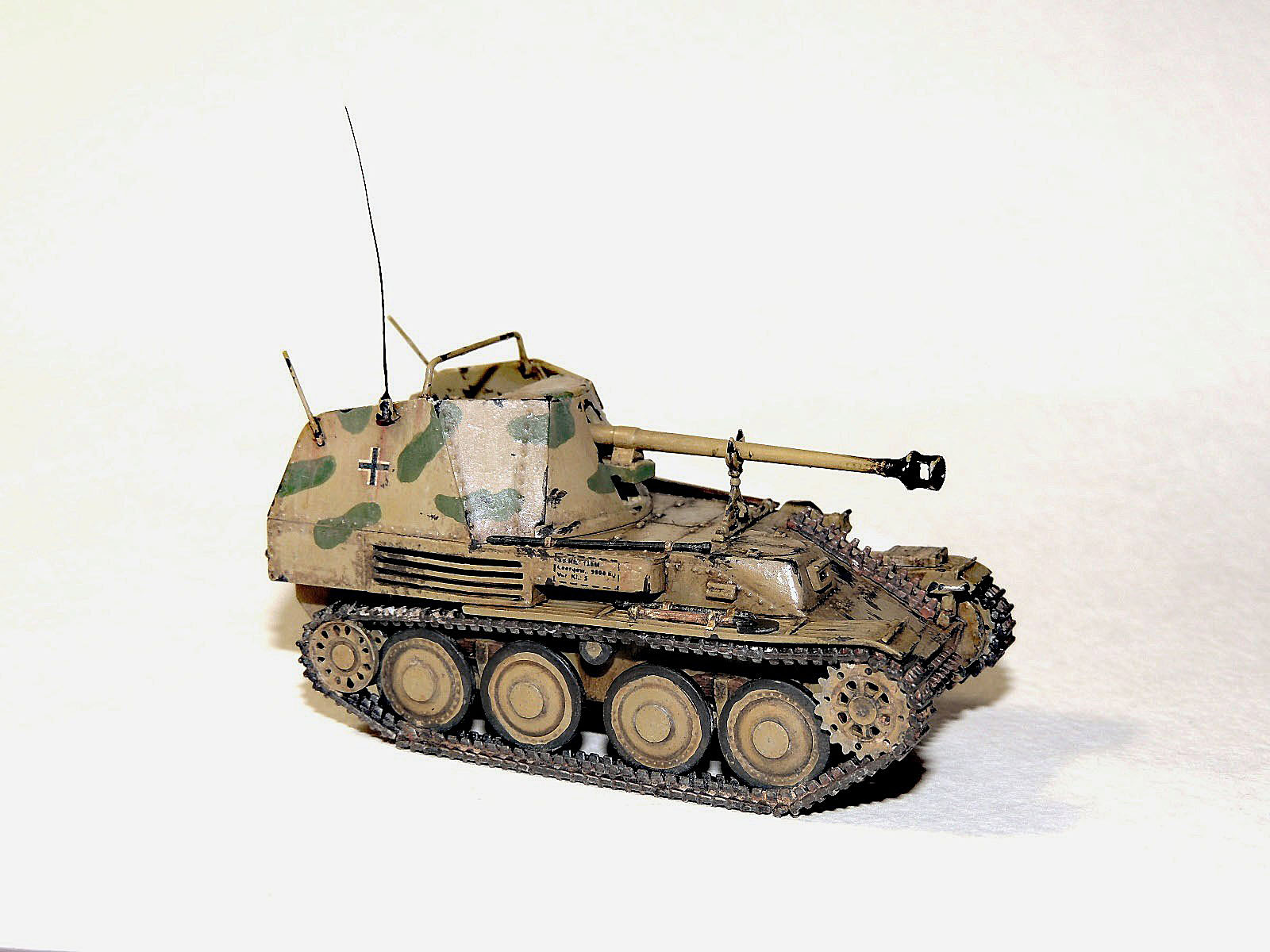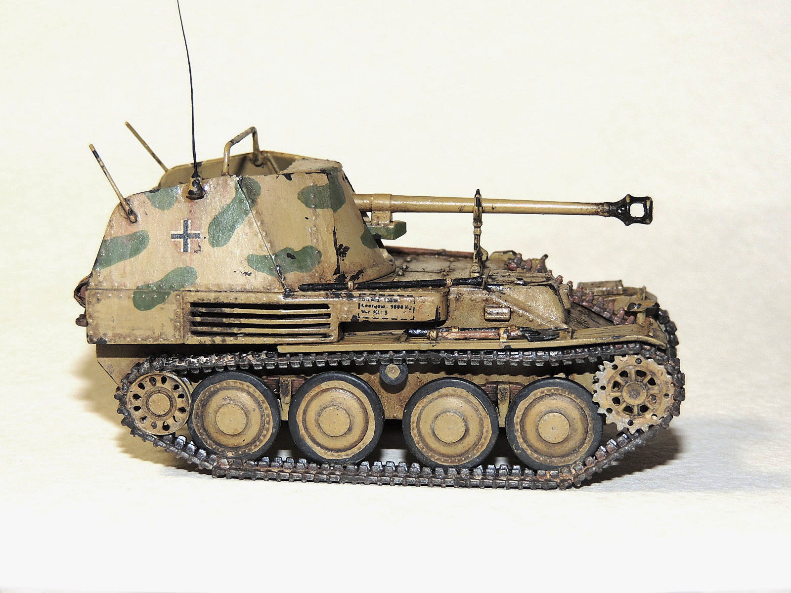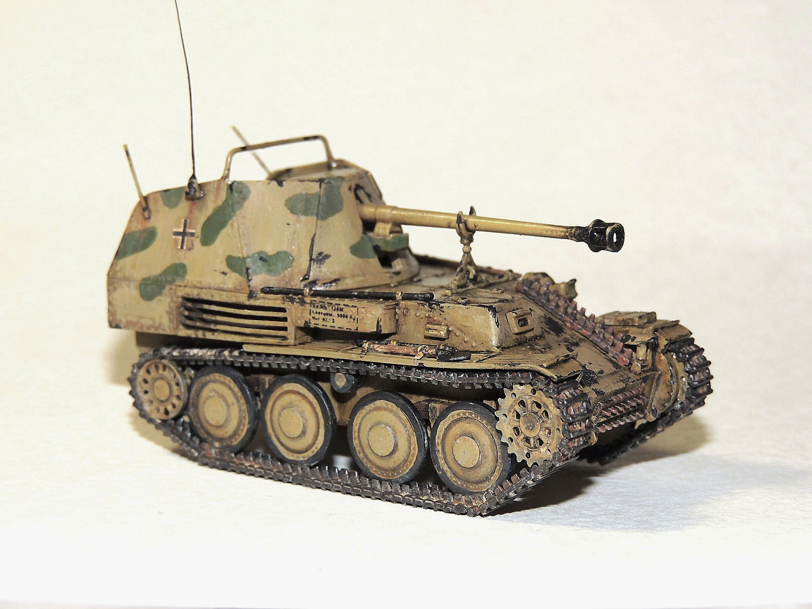 Получилось. Но мы ведь выставляемся для получения конструктивных табуреток. Посему ловите - потертости от обуви экипажана лобовой броне не удались. Попробуйте в следующий раз взять кусочек поролона, макнуть в краску, дать подсохнуть - потом протереть в местах прохода экипажа. (Соответсвенно потреноровавшись на "кошке"