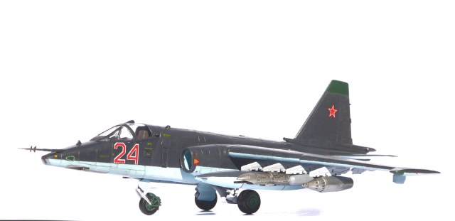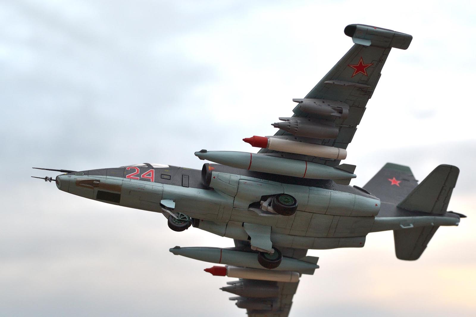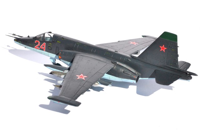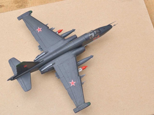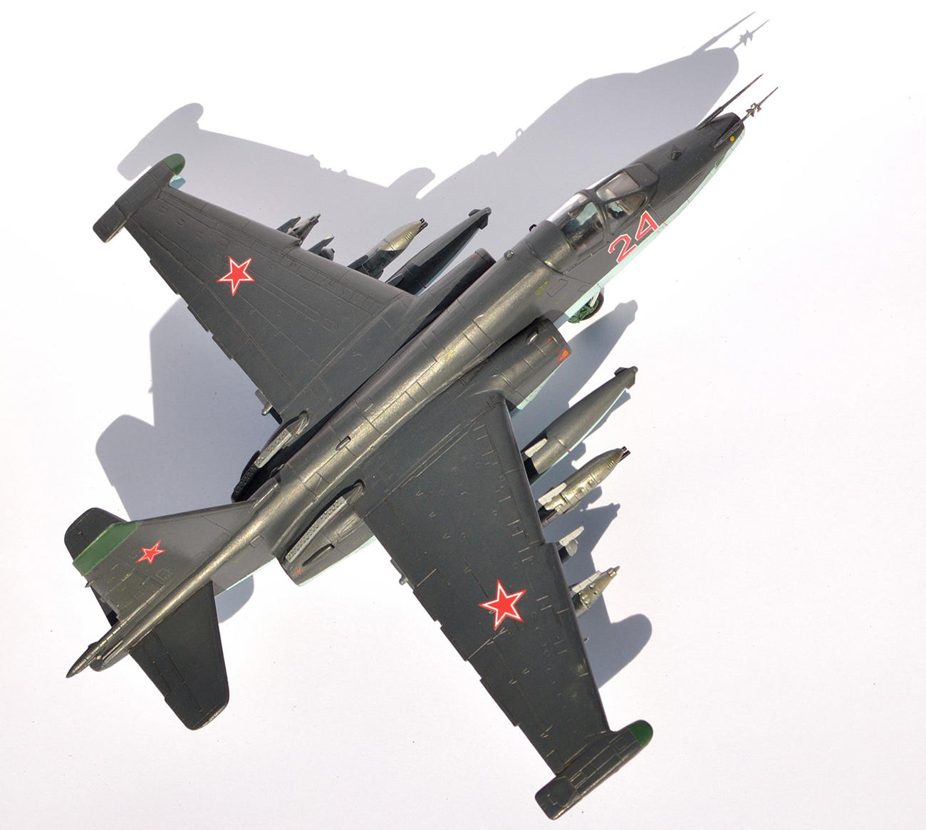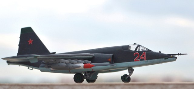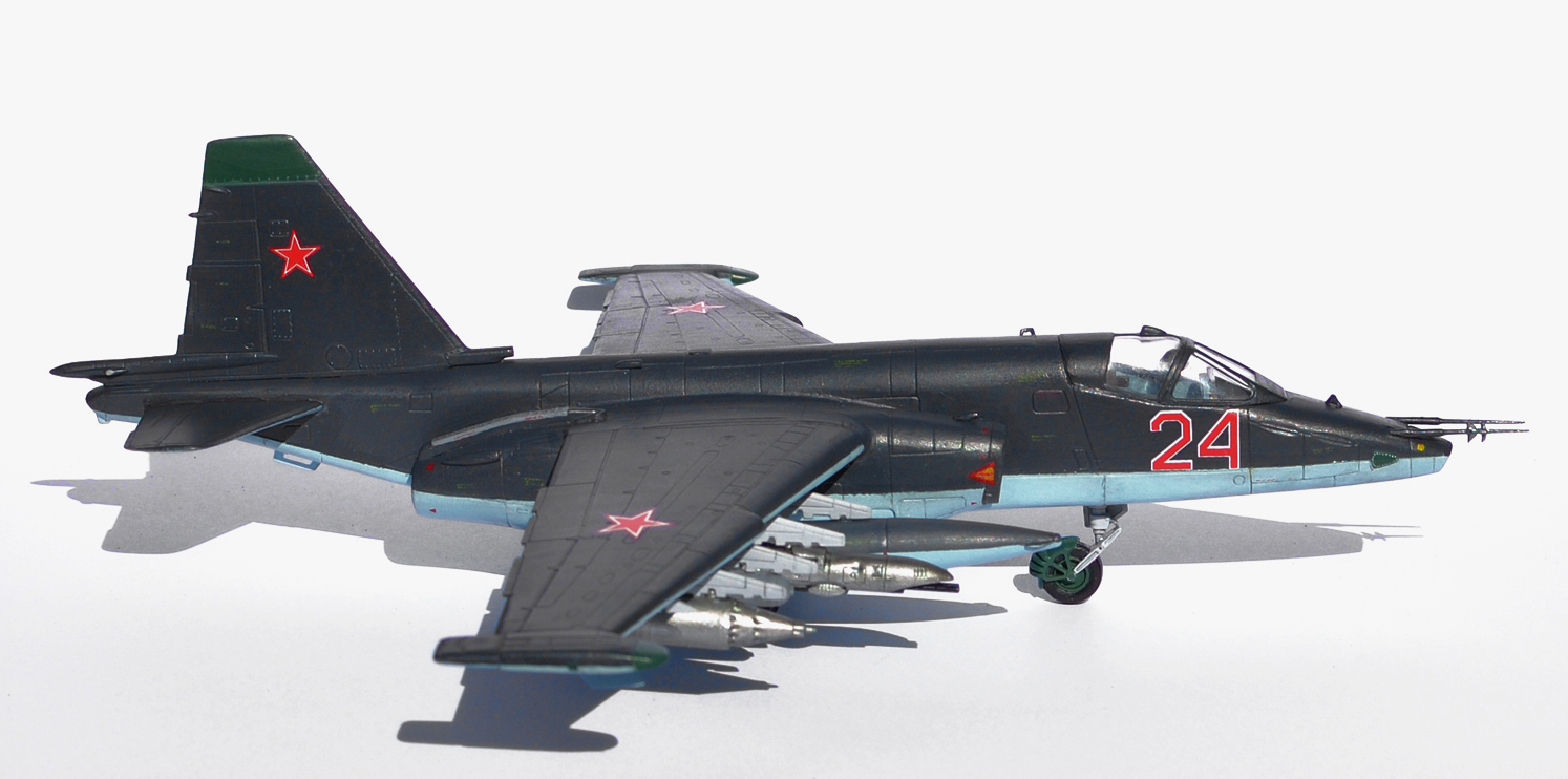 Модель собрана аккуратно! Как обслуживающий Су-25 могу сказать, что у Звезды совершенно неправильная носовая часть и фонарь кабины. На Вашей модели нет антенны АРК-15, а она на гарготе очень четко смотрится.