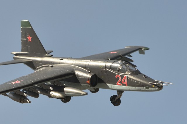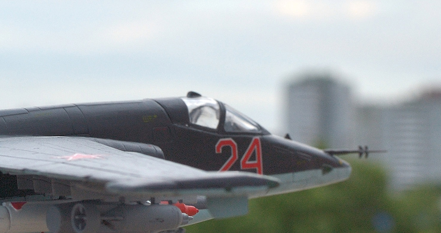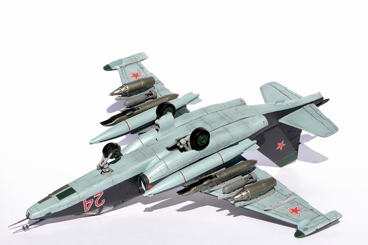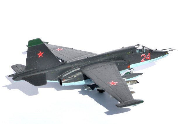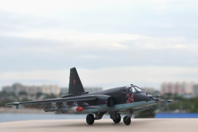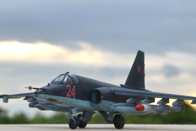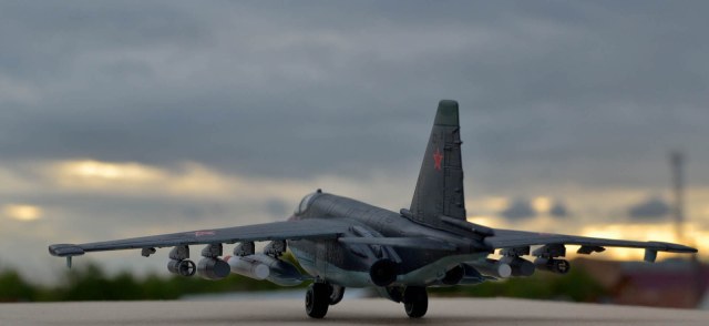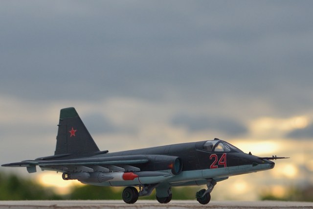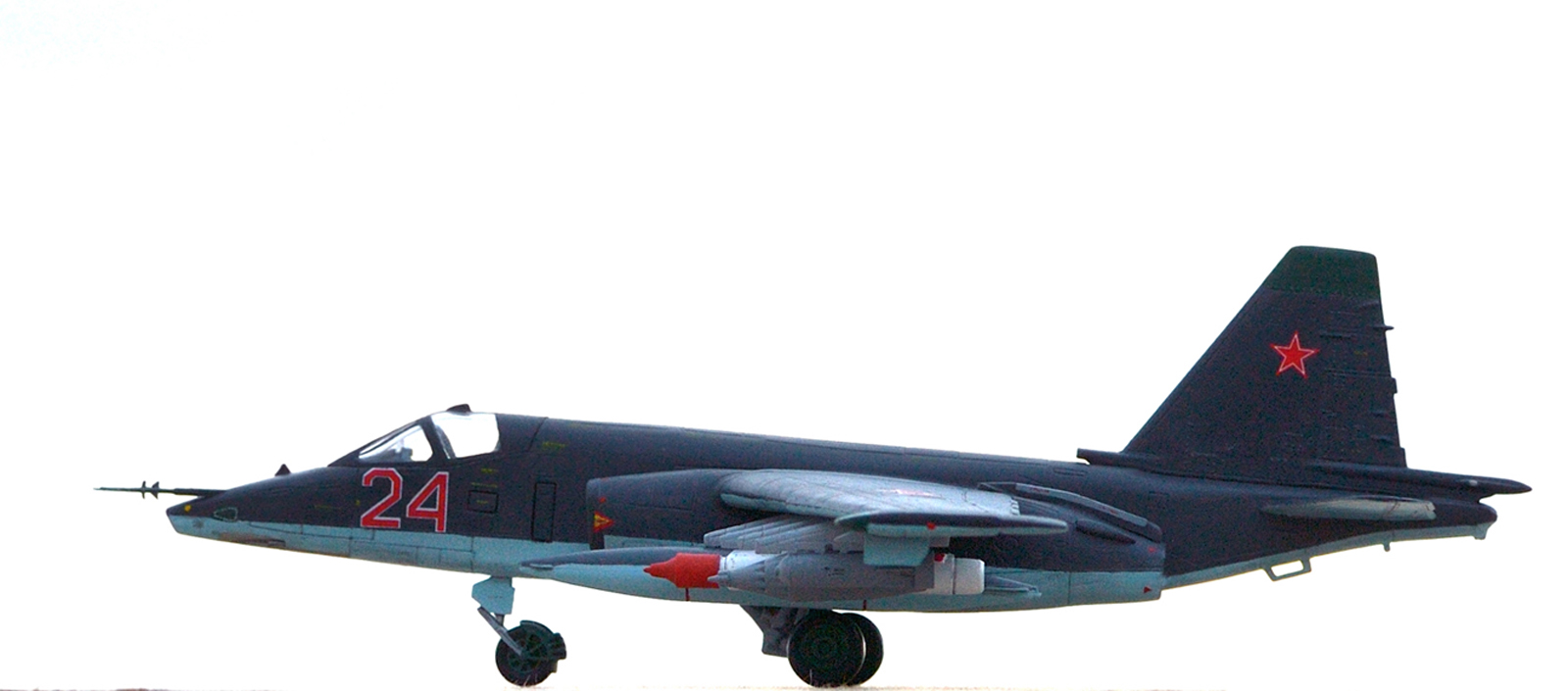 Модель собрана аккуратно! Как обслуживающий Су-25 могу сказать, что у Звезды совершенно неправильная носовая часть и фонарь кабины. На Вашей модели нет антенны АРК-15, а она на гарготе очень четко смотрится.