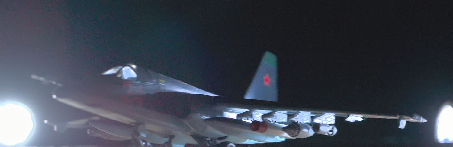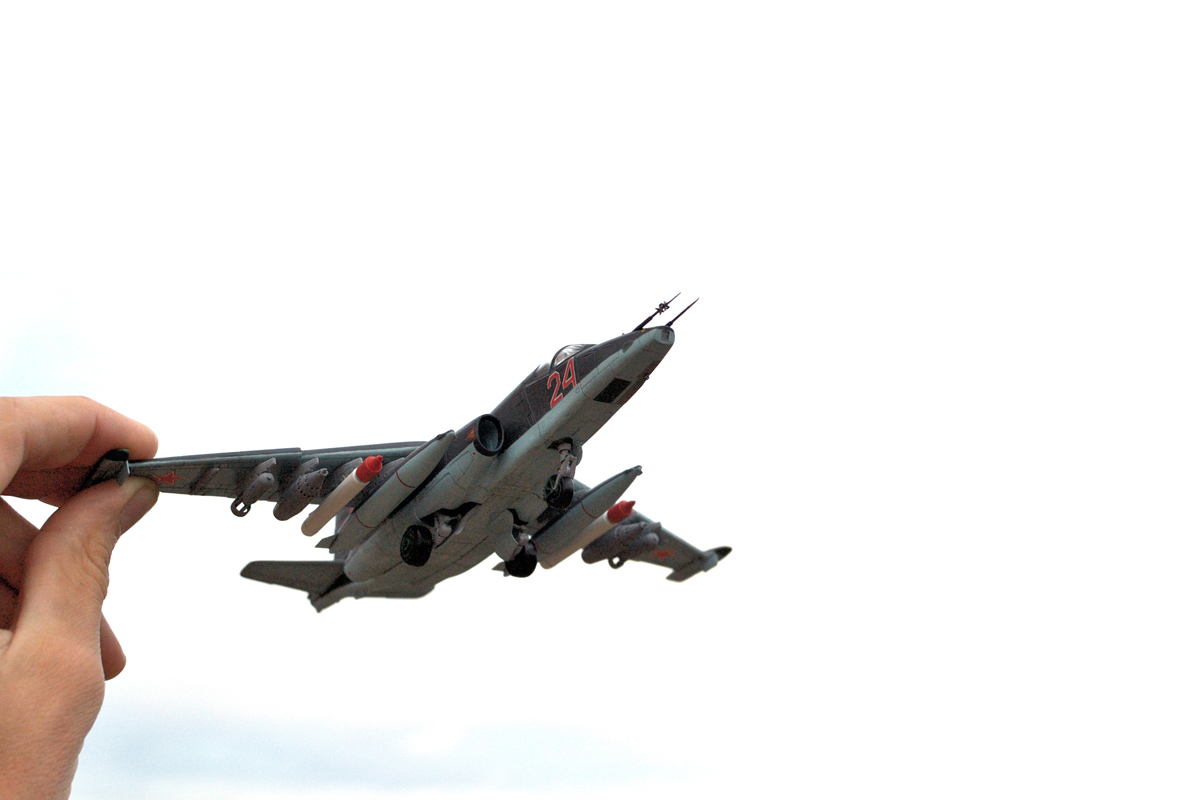 На правом воздухозаборнике нет входных устройств ВВР(сверху) и турбохолодильника(снизу) -это отличительный знак Су-25. На балочных держателях нет ухватов, которые фиксируют подвеску(но это к производителю). А вот фотосессия порадовала.
