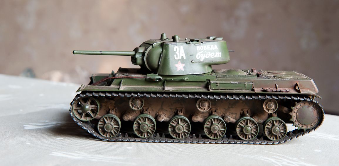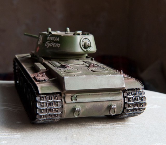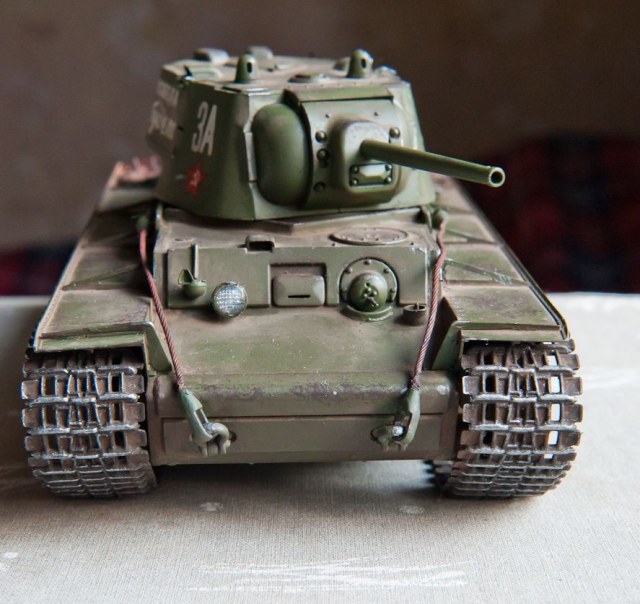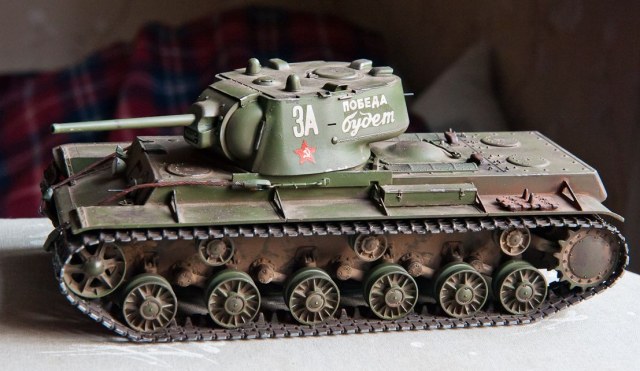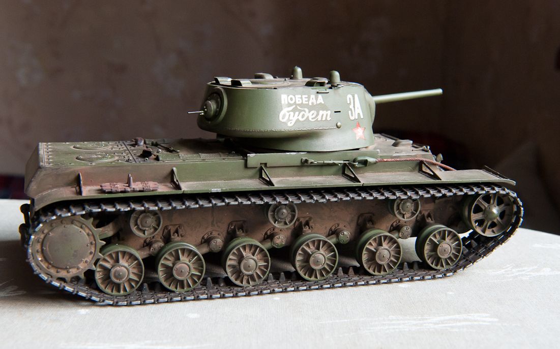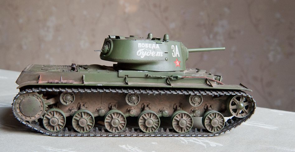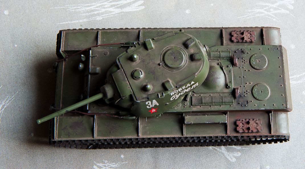Неплохой КВ, покраска/тонировка на уровне. Декаль блестит и озадачила своим смыслом, кстати у меня в КВ-2 с большой башней от Трумпетера в декали было отдельное слово "НАМИ", уж не окончание ли этого лозунга?
