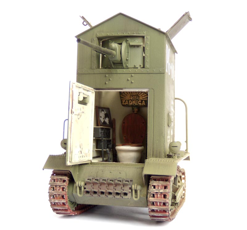 Генерал был крайне удручен поражениям армии на фронтах, и не обратив внимание на сарказм Скорцени, он всю ночь, и обратную дорогу обдумывал свой план: - «для действий в густонаселенной местности нужна бронированная машина с экипажем из 2-3 человек, вооруженная противотанковым орудием. Основной особенностью является то что в дневное время машина камуфлируется под сельский туалет, устанавливается на выгребную яму (вырытую экипажем) и может выполнят основную функцию – дать возможность оправлять естественные потребности. Но с наступлением ночи, машина незаметно выдвигается во вражеские тылы и становиться грозным оружием.»