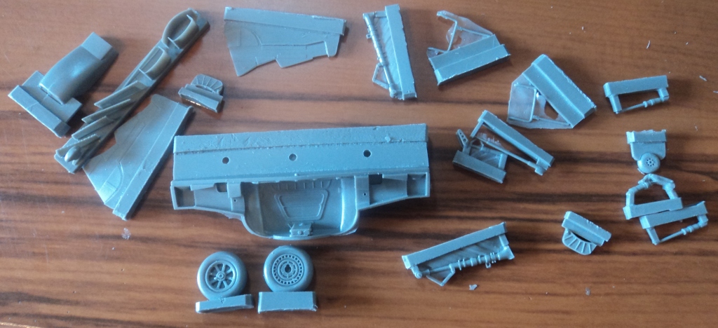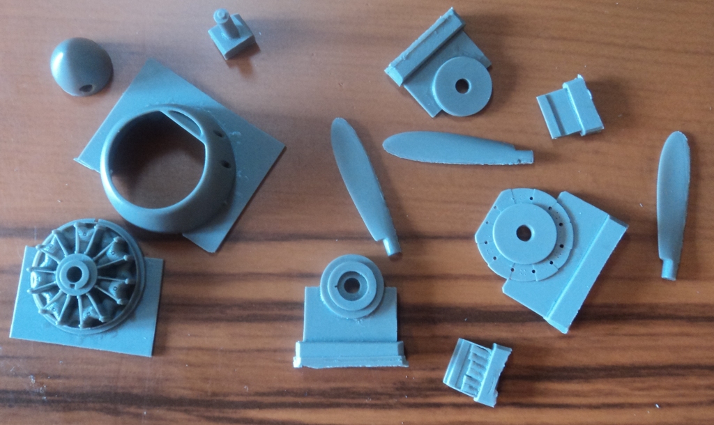 И, наконец, пятый пакетик. Радиаторы, створки радиаторов, стойки шасси, щитки шасси, шасси. Все отлито довольно недурно, лично мне нравиться =)
