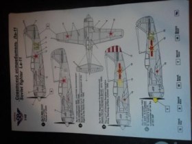 Инструкция по окраске - цветной листок формата А5, на 4 варианта (ВВС СССР, советских ВВС, участник высокоширотной экспедиции 1948 года, ВВС, Народной Освободительной Армии Китая, аэродром Дачан, лето 1950, и командира 1АЭ 351 ИАП Н.Н.Гужова.