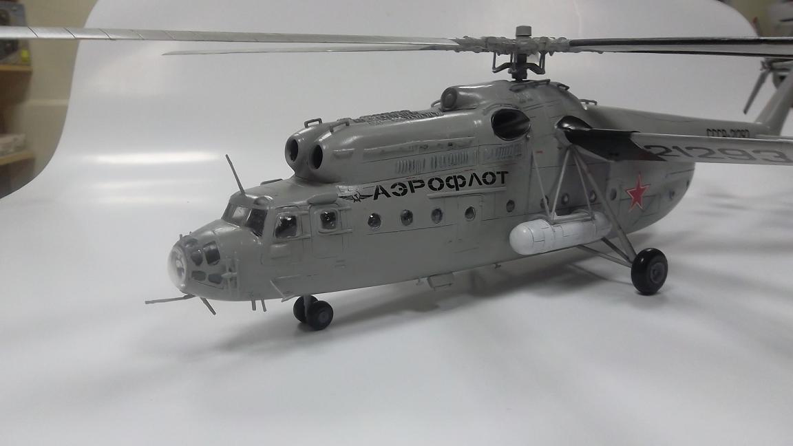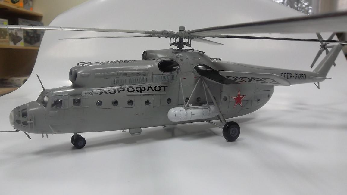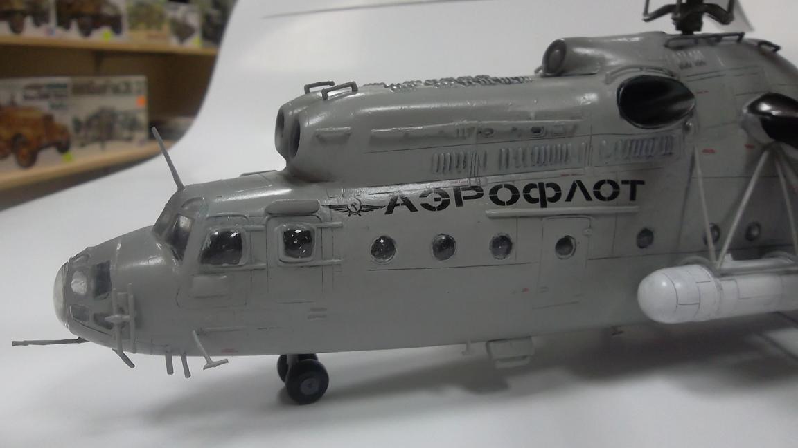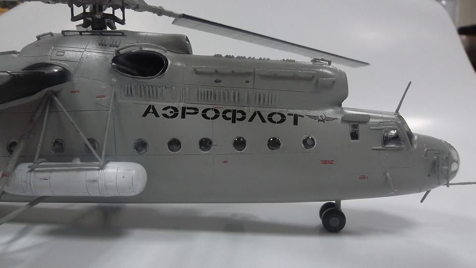 Недостатки озвучены, от себя добавлю,надпись "АЭРОФЛОТ" слишком затянута к носовой части. На Ми_6, "АЭРОФЛОТ" имел место под тягами баков, а герб почти над входной дверью.