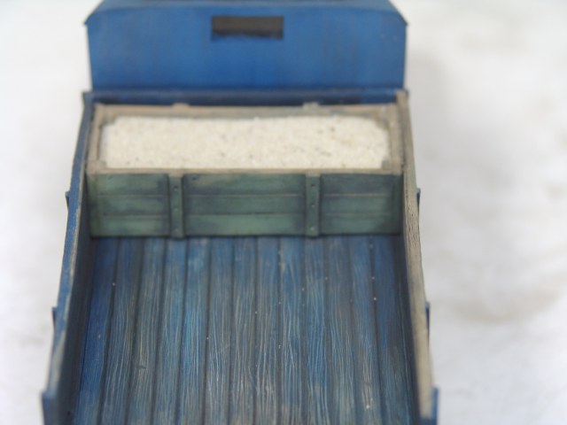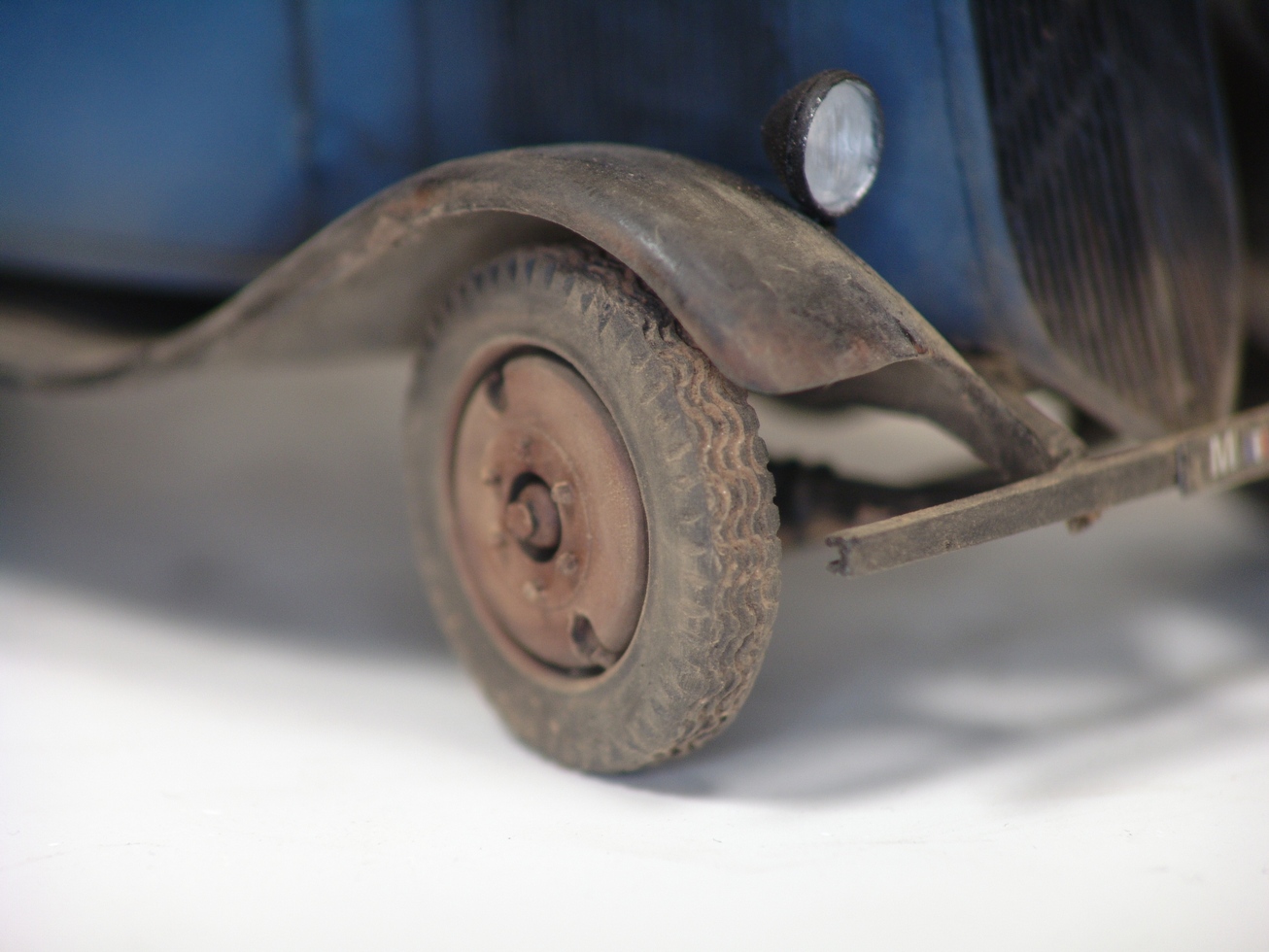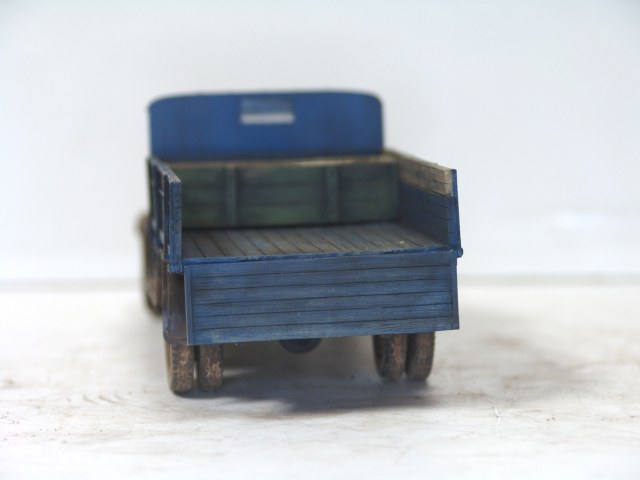 Царапины на дереве в кузове выглядят не очень реалистично, они должны быть прямые, а не волнистые, вот как то так. И еще самый интересный элемент модели-неокрашенная доска, вообще на фото не раскрыт, все время не в фокусе, т.е. не хватает общего плана справа. А дворники на этой машине и правда были стеклянными?