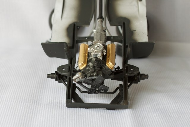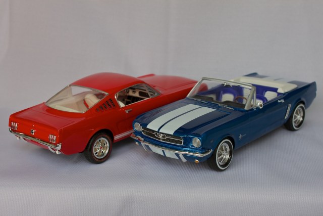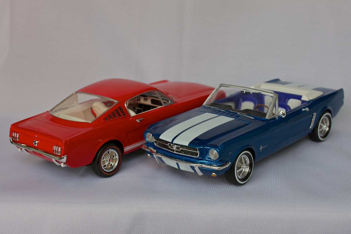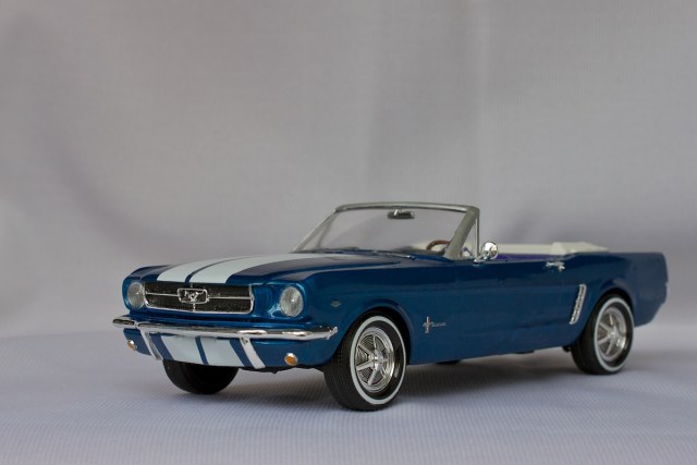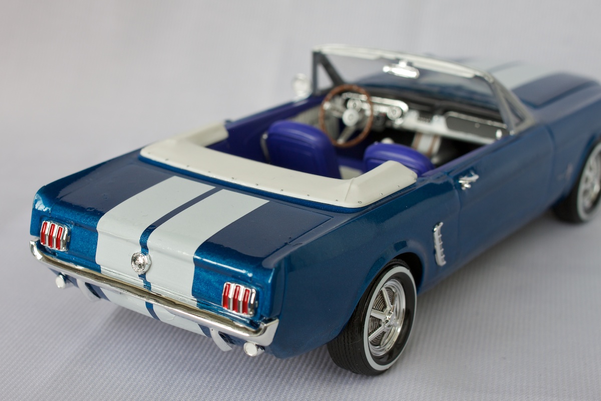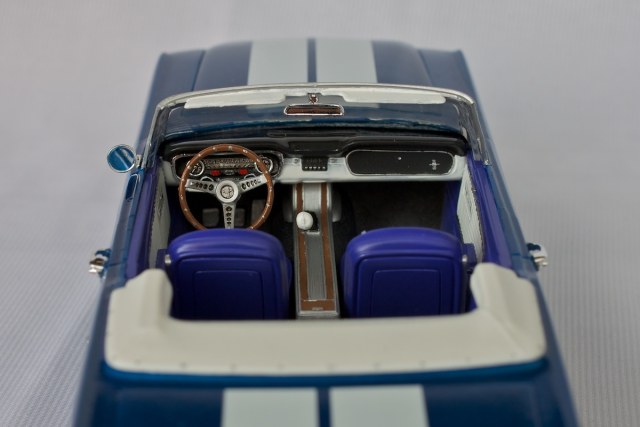 В этой модели все та же ошибка с баллончиком Testors. Не смог удержаться, увидел синий металлик и сразу купил, красил одновременно с "Буллитом", поэтому "работу над ошибками" делать было некогда... С цветом обшивки салона тоже немного не угадал, хотелось получить немного более "спокойный" цвет. Ну и "проработка" подкапотного пространства немного школьная. Надо постепенно учиться дорабатывать коробочный вариант.