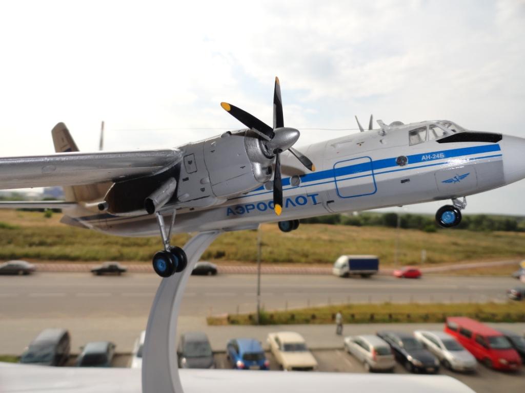 Модель имеет много косяков по технической части и окраске.Самое заметное - разные номера на бортах и крыле.Кстати,борттехник никогда не занимался покраской дисков колёс и прочего,для этого существует Отдел Главного Механика(ОГМ),имеюший штат маляров.Распространённый цвет дисков колёс - зелёный(разных оттенков),или чёрный,других не встречал.Этот Ан-24 имеет модификацию "Б" и оборудован ВСУ ТГ-16,а не РУ-19,которые устанавливались на Ан-24РВ.Про остальные недочёты уже сказано выше.Успехов!