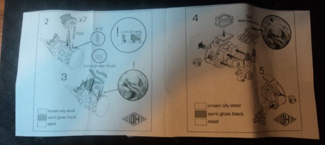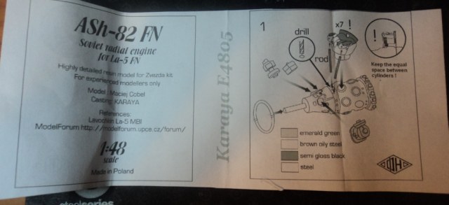 Коробочка 60х95х35, инструкция по сборке, какой-то информационный листок и сама модель двигателя. Проработка достаточно неплохая, но потребует некоторых доработок.