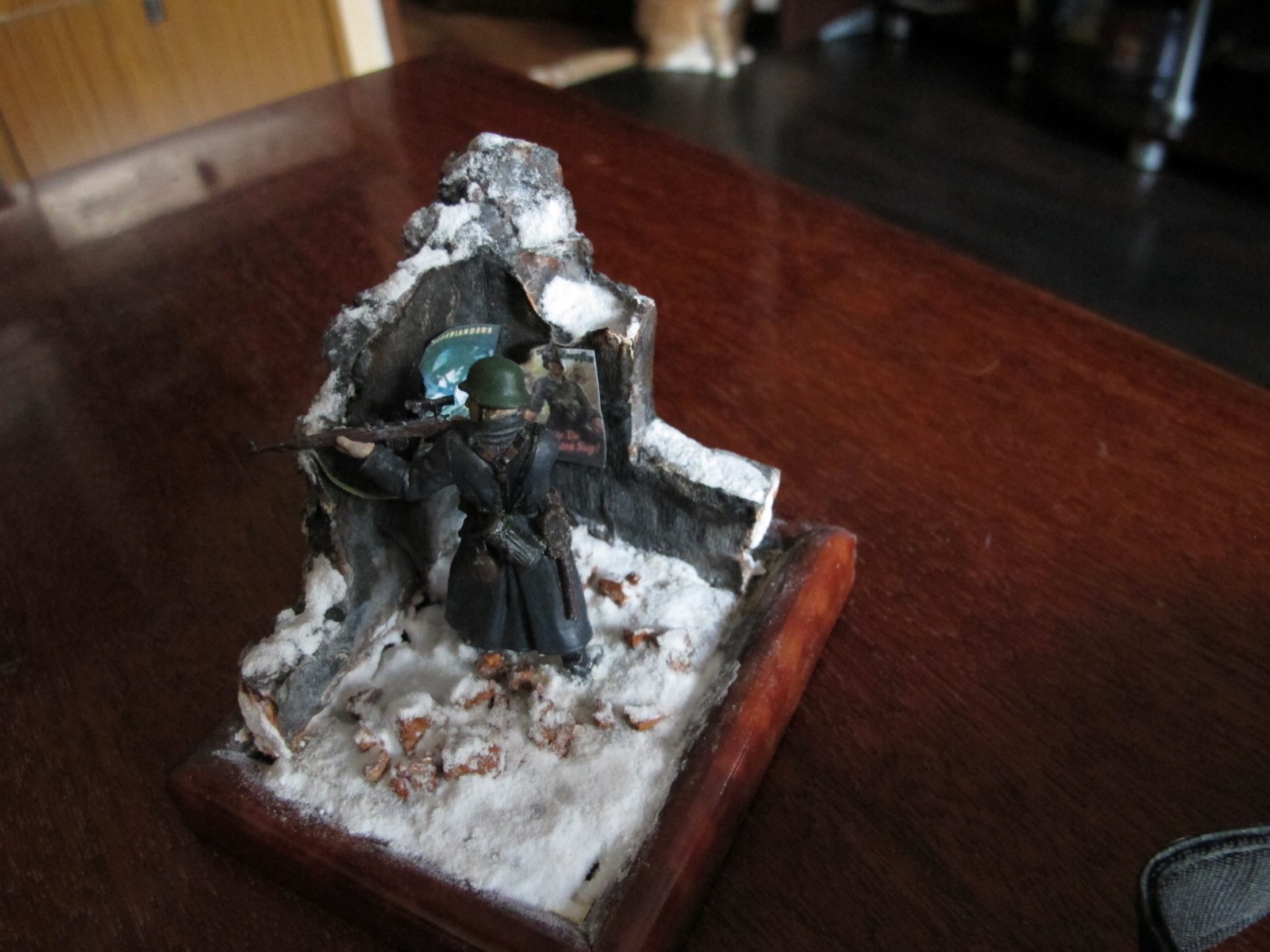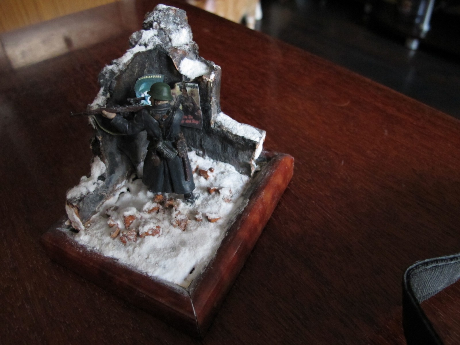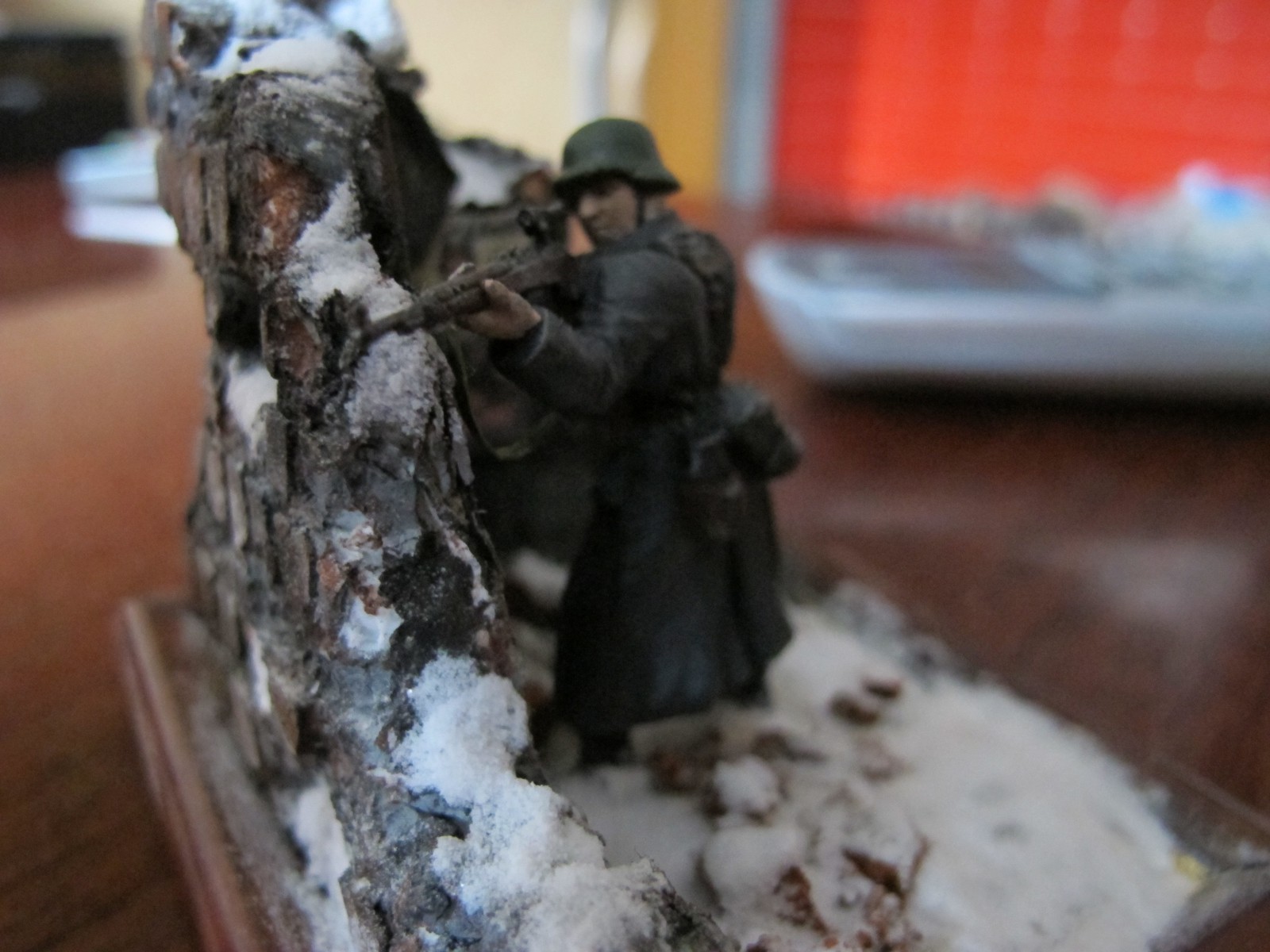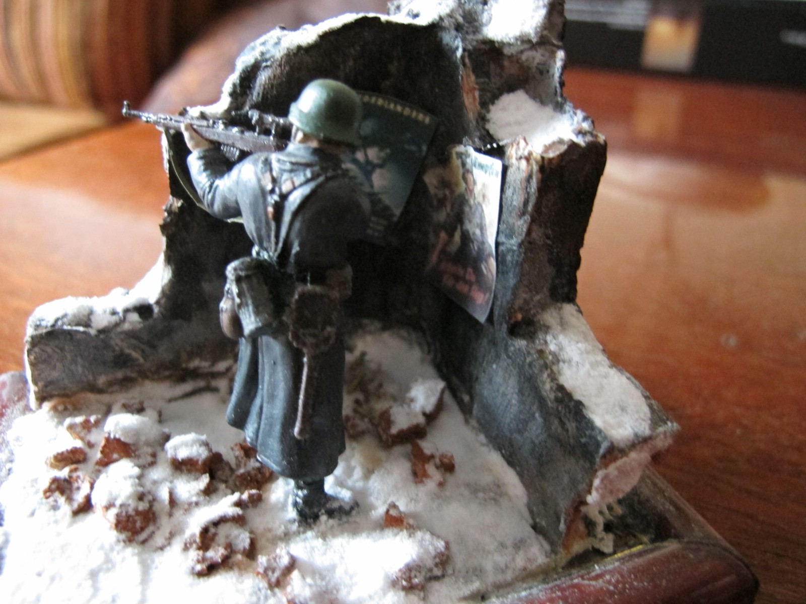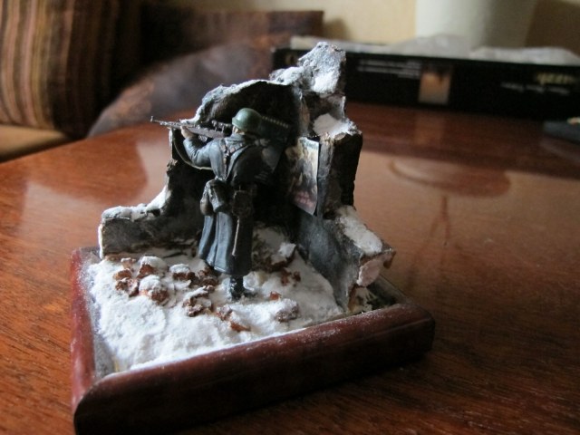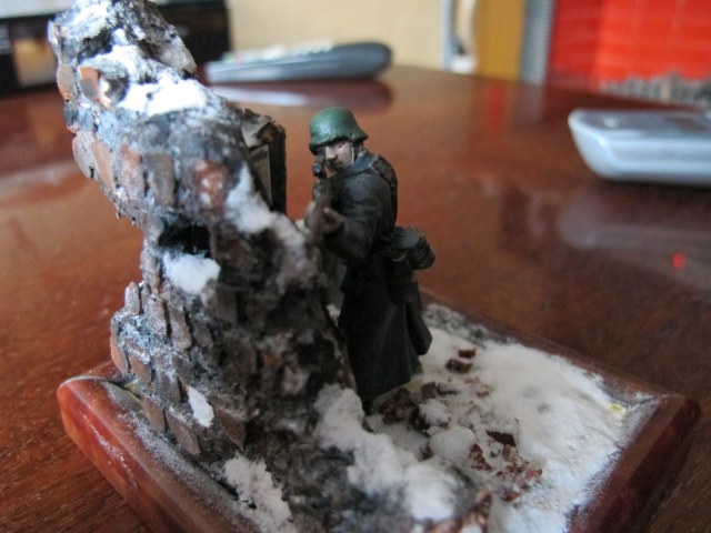 масштаб 1/32 ,стена пенопласт расшивка кирпичей нанесённая Боларс шпаклёвка впоследствии расшитая,ремень на винтовке фольга от тюбика Момента(фольга мягкая работать легко),окрас фигуры эмалями Тамия,Звезда,лицо масло ,снег сода+ПВА,плакаты- принтерная печать,груда кирпичей пробковое дерево,жду отзывов и пожеланий