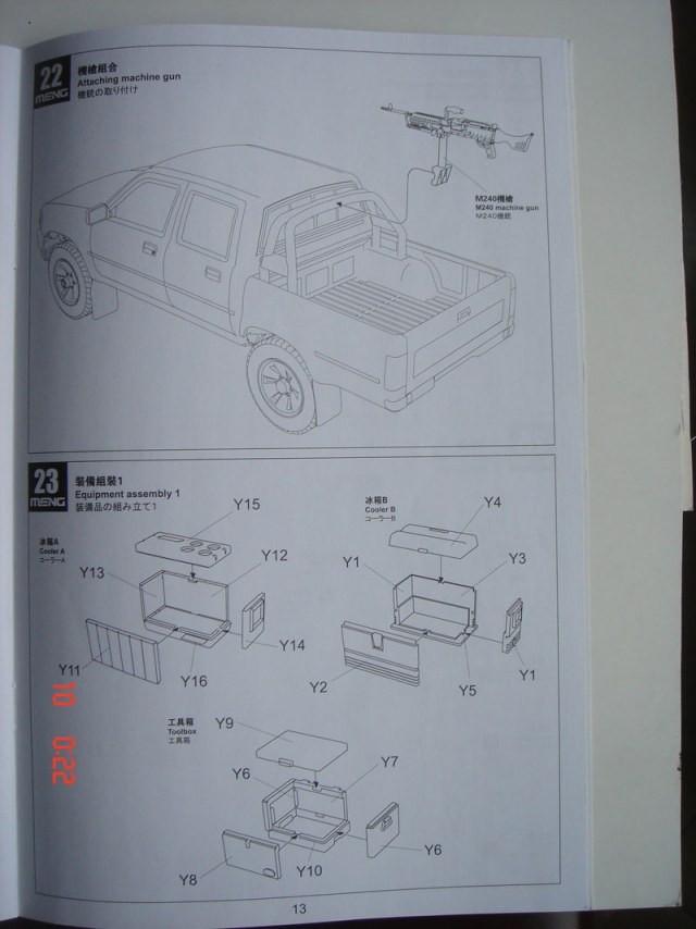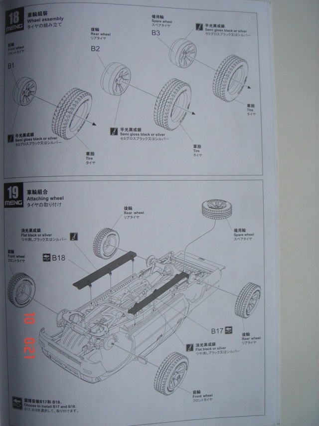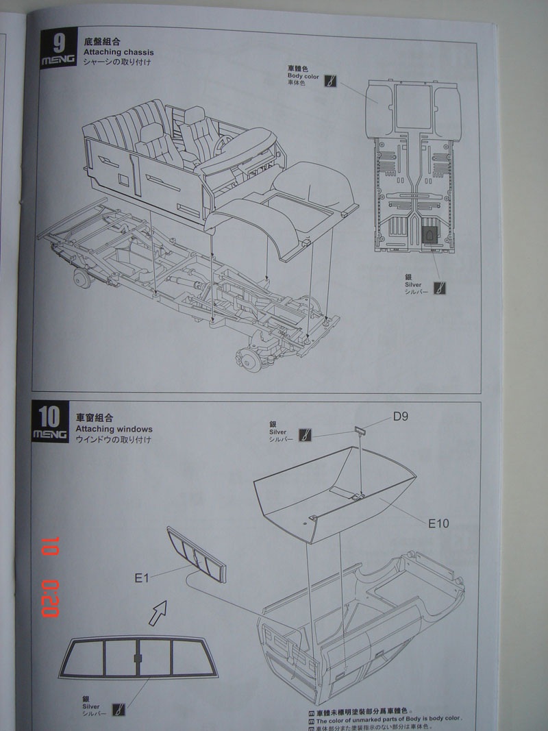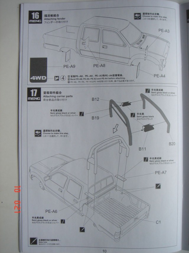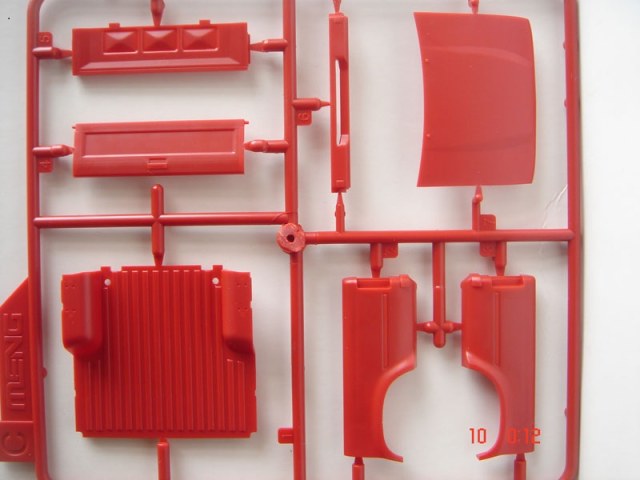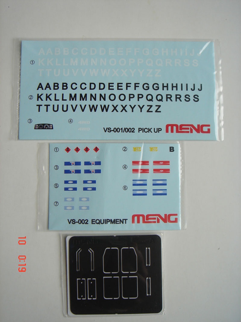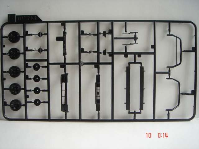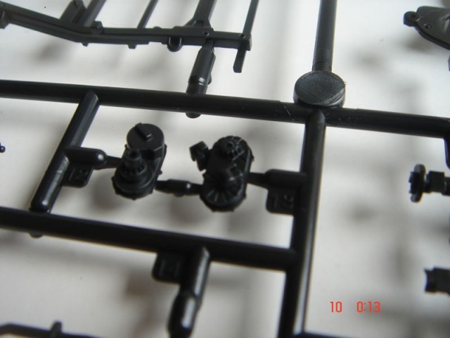 Итак о самой модели: внутри 10 литников, кабина, 3 листка с деколями, литник с фигурой, со всяким скарбом, бутылки, остекление кабины, фары, маленькая платка с травлением и набор из шести шин. С первого взгляда на литники видно, что пластик очень хорош, хорошее качество деталировки, облой отсутствует, следы от пресс форм находятся с невидимой части детали, про стыковку пока говорить рано.