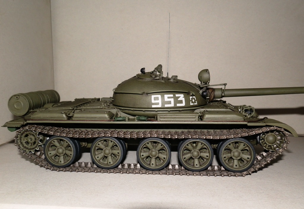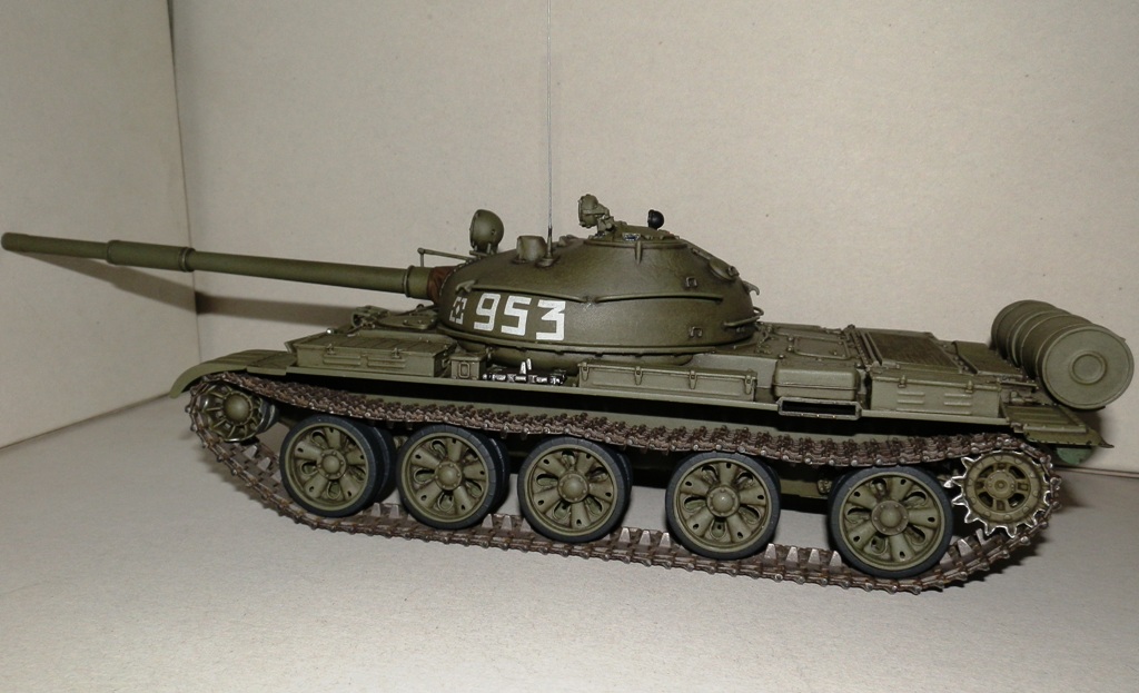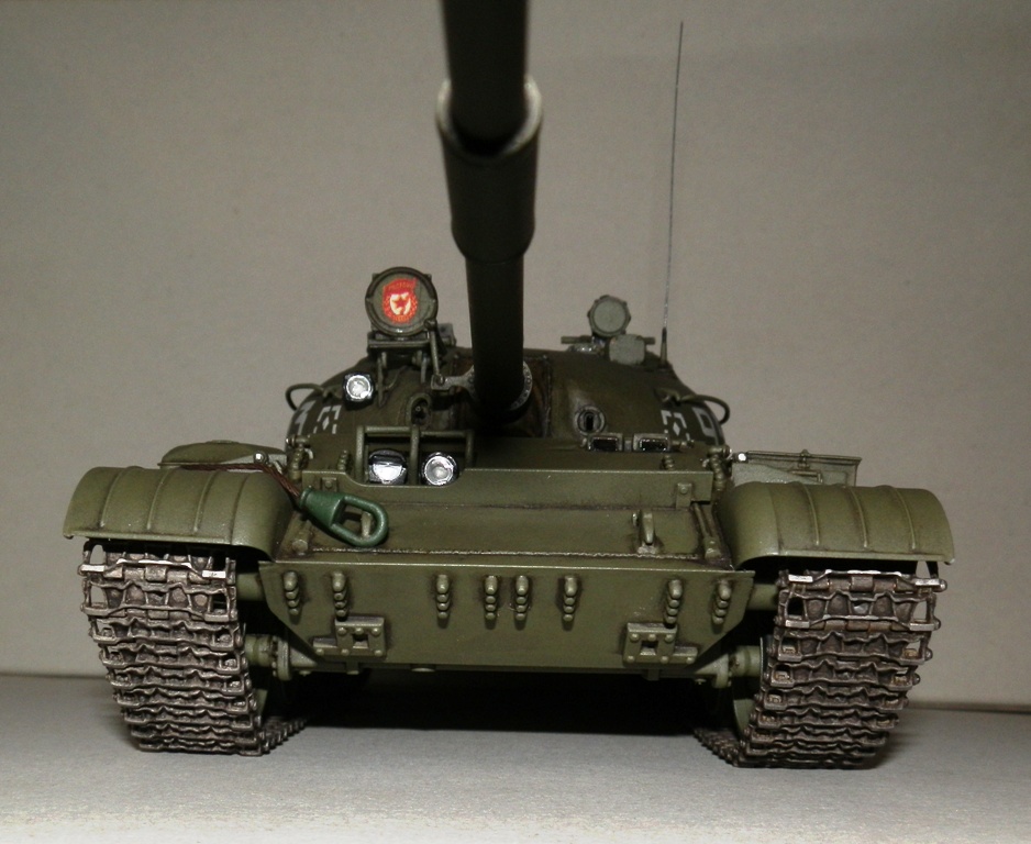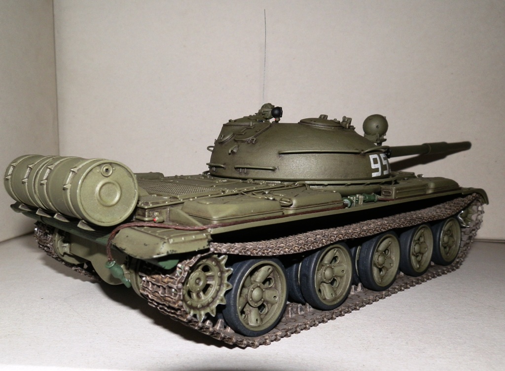 Здравствуйте, уважаемые коллеги, разрешите представить еще одну свою модель, танк Т-62, сделанный сравнительно недавно. Сама модель оставила приятные впечатления, облоя и нестыковок было по минимуму, но тем не менее модель собирал в течении трех-четырех месяцев. Сборка, как всегда у меня, изкаробочная, с незначительными доработками. Добавил кое где сварные швы по корпусу, топливопроводы к топливным бакам, "застеклил" на башне "слепой" прибор наблюдения, добавил проводку к луне, пулемет - игла, антенна - тянутый литник. На данной модели впервые попробовал металлические траки от Фриула, остался весьма доволен, небольшую сложность вызвала их тонировка, чернил уксусом, затем смывка масляной краской и шлифовка шкуркой по грунтозацепам. Красил модель кистью, акрилом Валехо, цвет мешал сам. Декали из набора. Смывка-тонировка Миг, финишное покрытие - матовый лак из баллона.
