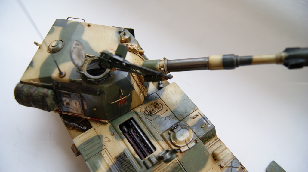 Всем доброго времени суток. Представляю на Ваш суд китайскую сау фирмы Trumpeter. Модель в сборке довольно простая. Изначально хотел сделать модель открывающейся, дабы увидеть все внутренности, но в ходе работы понял, что внутрянка исполнена не так точно как хотелось бы поэтому эта идея отвалилась. Из дополнений, переделал переднии блок фары, высверлил ствол пулемета, заменил все поручни на проволочные, на буксировочных тросах использовал настоящий тросик, сделал маскировочную сеть и ремни крепления для нее, во всей оптике вставлена фольга с пленкой синего цвета, хотел сначала сделать из CD, но диск не подошёл по толщине. На данной модели я в первые для себя попробовал методы окраски камуфляжа с помощью аэрографа, а также попробовал метод окраски "цветовая модуляция", кто не знает о чем речь смотрим здесь http://www.youtube.com/watch?v=Sy72i-SsLZ8&feature=related. Так же впервые собирал модель с интерьером. Красил тамия акрил, фильтр и загрезнения фирмы Миг. Ну приятного просмотра, ловлю табуретки.