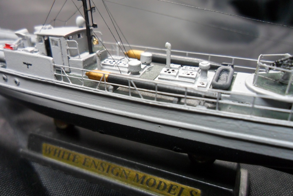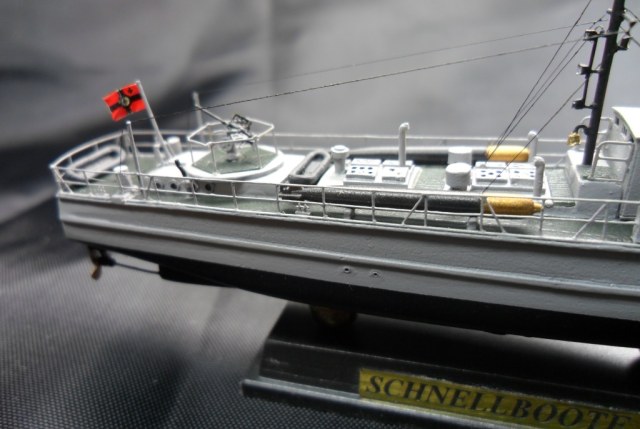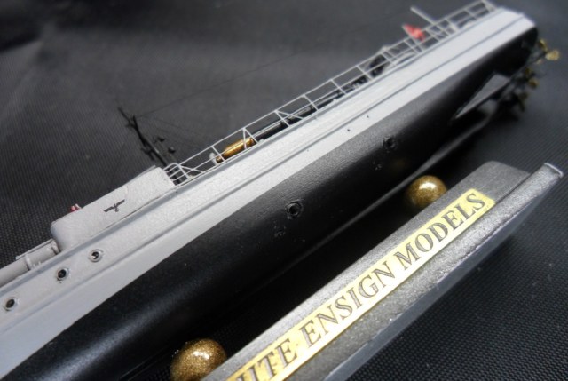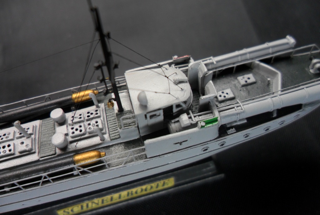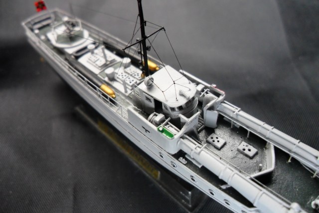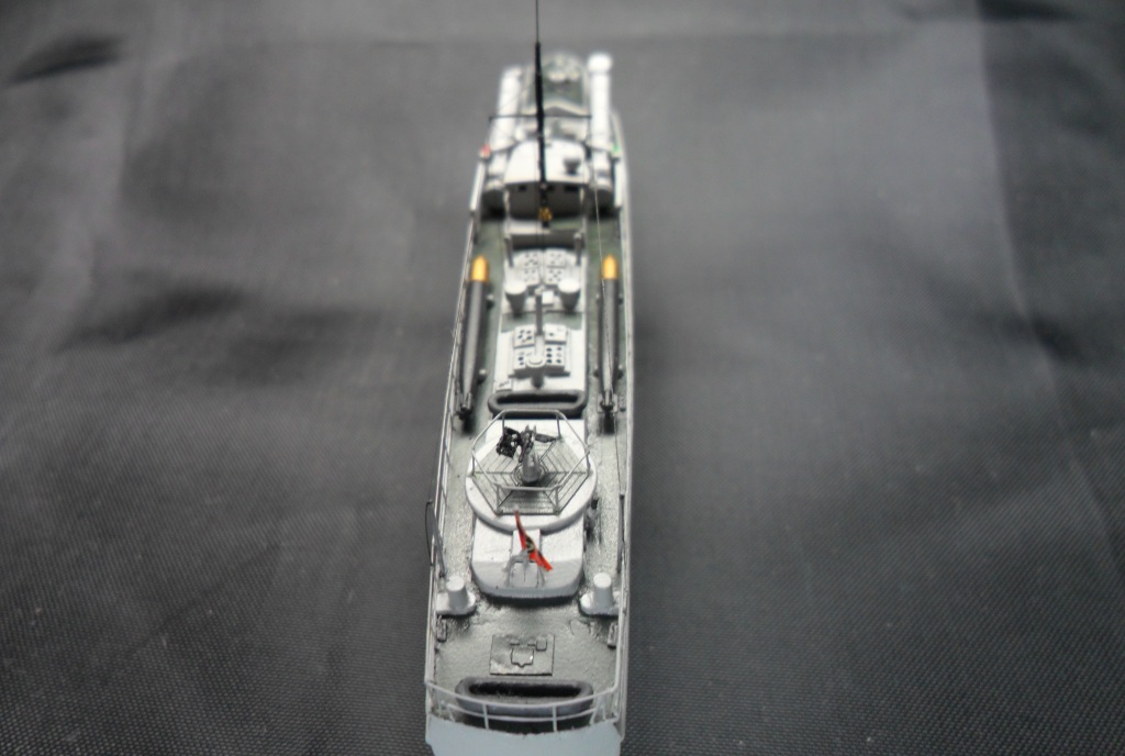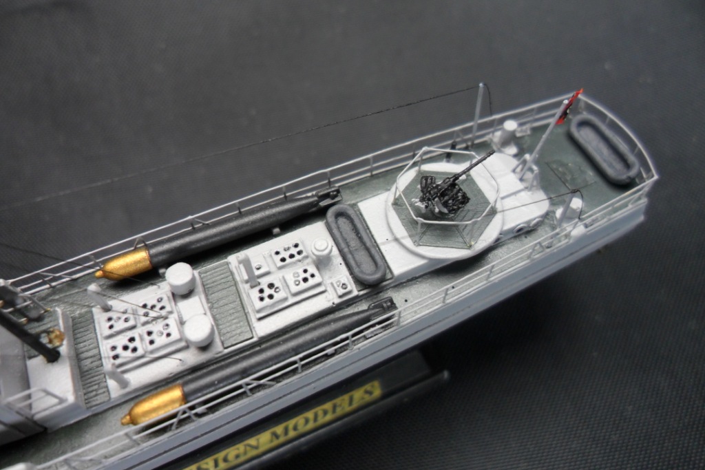 В процессе изучения матчасти также снуля были изготовлены: ТА(родные оч. маленькие), рубка с интерьером, мачта со всеми наворотами, дощатый настил палуб, различные стойки, подставка. После изготовления новых ТА на изготовление торпед сил уже небыло (у родных хромала масштабность и хвостовое оперение вообще непонятной формы). Торпеды использовал из наборов U-ботов фирмы AFV. Одна торпеда даже поместилась в аппарате и ее можно немножко увидеть сквозь приоткрытую переднюю крышку.