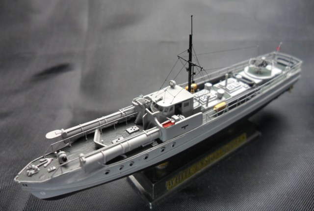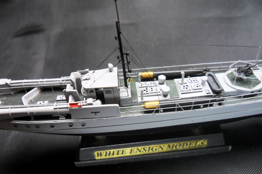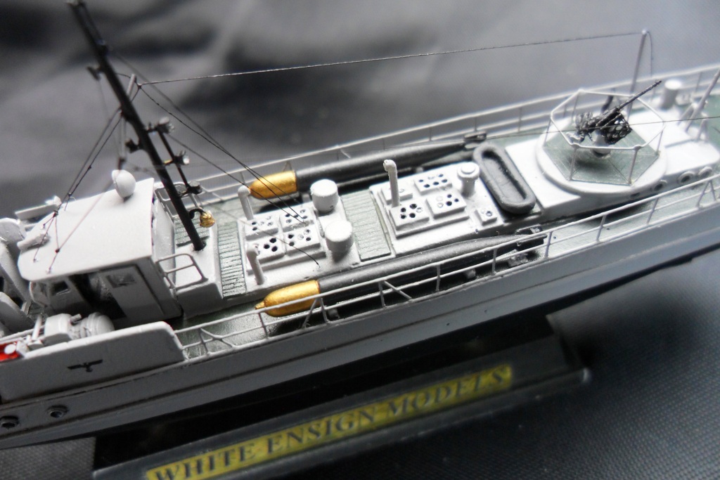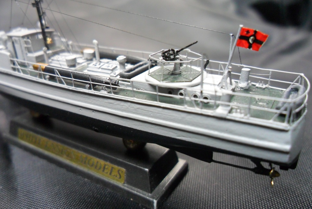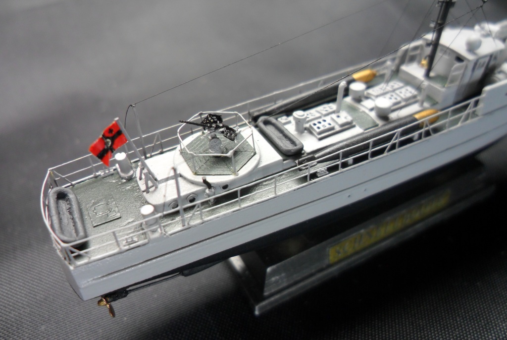 В процессе изучения матчасти также снуля были изготовлены: ТА(родные оч. маленькие), рубка с интерьером, мачта со всеми наворотами, дощатый настил палуб, различные стойки, подставка. После изготовления новых ТА на изготовление торпед сил уже небыло (у родных хромала масштабность и хвостовое оперение вообще непонятной формы). Торпеды использовал из наборов U-ботов фирмы AFV. Одна торпеда даже поместилась в аппарате и ее можно немножко увидеть сквозь приоткрытую переднюю крышку.