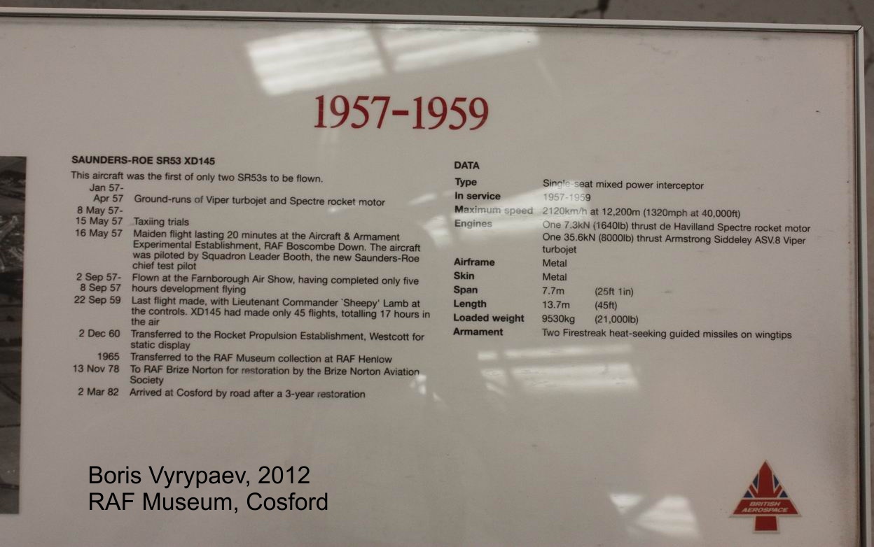 Расскажу об истребителе-перехватчике Saunders-Roe SR.53, который проектировался в соответствии с тактико-техническими требованиями ВВС к истребителю-перехватчику с комбинированной двигательной установкой. Исследованием вариантов такого самолёта фирма «Saunders-Roe» занялась в 1951 г., а в 1953 г. она официально приступила к созданию опытного образца, облёт которого состоялся 16.05.1957 г. Внимание конструкторов самолёта привлекла двухдвигательная схема, сочетающая высокую экономичность турбореактивного двигателя с постоянными (независимо от высоты) данными ракетного двигателя. Однако уже в период проведения опытно-конструкторских работ было решено построить лишь два опытных образца самолёта - один для лётных испытаний двигателей (SR.53 оказался первым и единственным британским самолётом с комбинированной двигательной установкой), а второй как экспериментальную машину в рамках разработки самолёта SR.177, поскольку от серийного производства SR.53 в качестве истребителя-перехватчика отказались.
