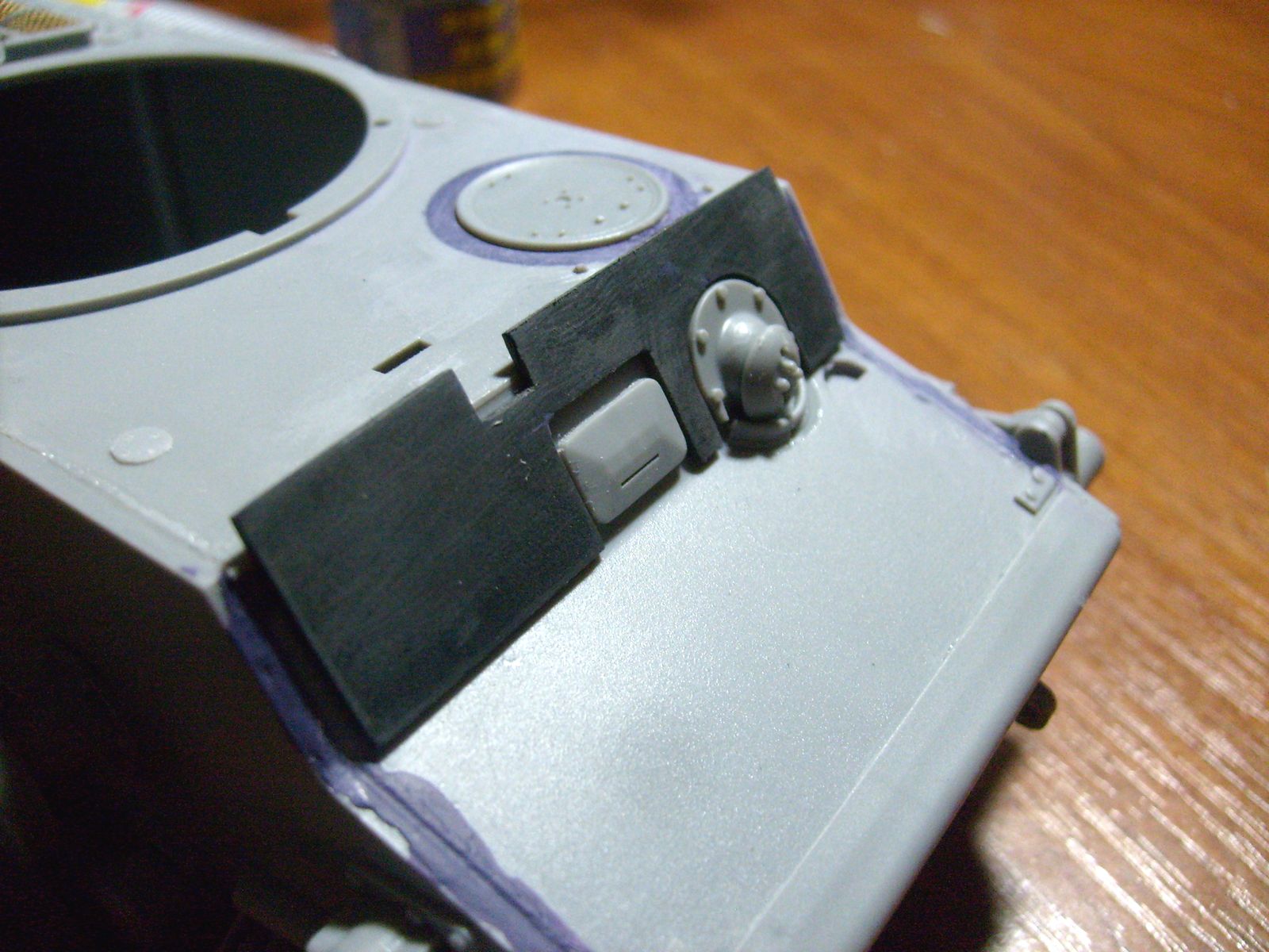 Подправлена доп. бронировка лба и бортов. Сварные швы на корпусе и башне. Фара, тросы.