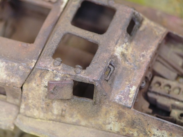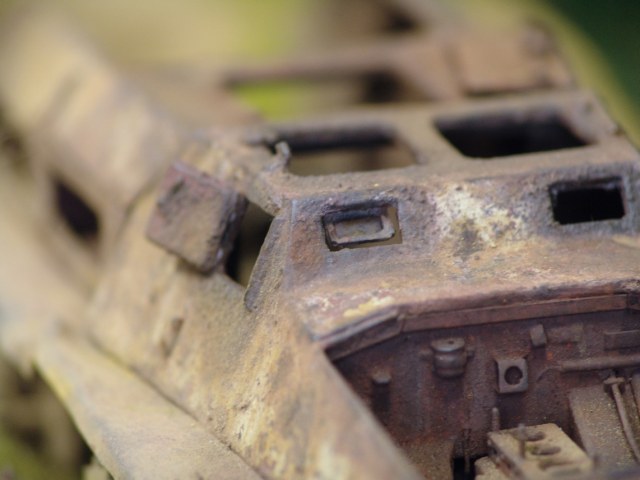 Затем лак для волос, соль и красная немецкая грунтовка. После этого соль стандартно стирается. По "проплешинам" ржавчины, но так что бы захватывались края грунта снова лак+соль. Потом стандартный немецкий желтый. Опять лак без соли. И напоследок высветленный желтый. Потом соль стирается до красного грунта. Собственно по основным операциям заканчиваем. Стандартные методики. Следующий этап это тонировка пятен ржавчины. Собственно ничего особо сложного, гораздо сложнее было делать коробки противогаза из металла))))