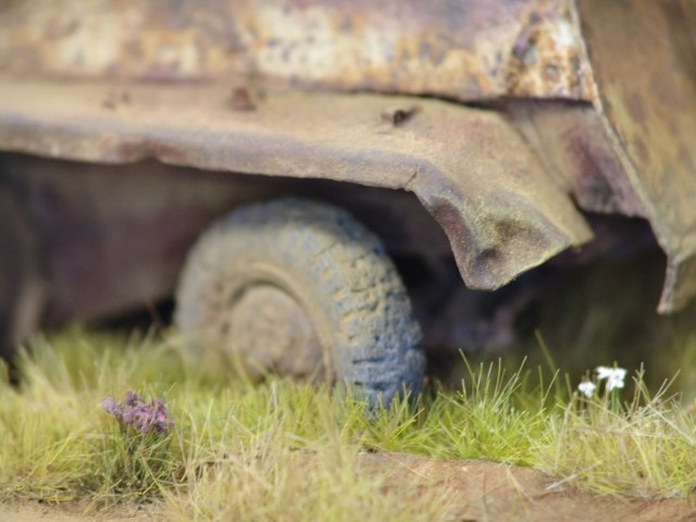 ...Очень понравилась Ваша диорама!О недостатках сказали,разве что добавлю малюсенькую капельку дёгтя:если этот БТР стоит давно(около 10 лет например),то резина на колесе могла либо истлеть,либо сгореть.А в условиях тотального дефицита всего после войны,совершенно исправное колесо было бы снято и использовано по назначению например.Логичнее было сделать просто голый обод.