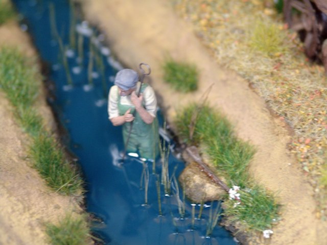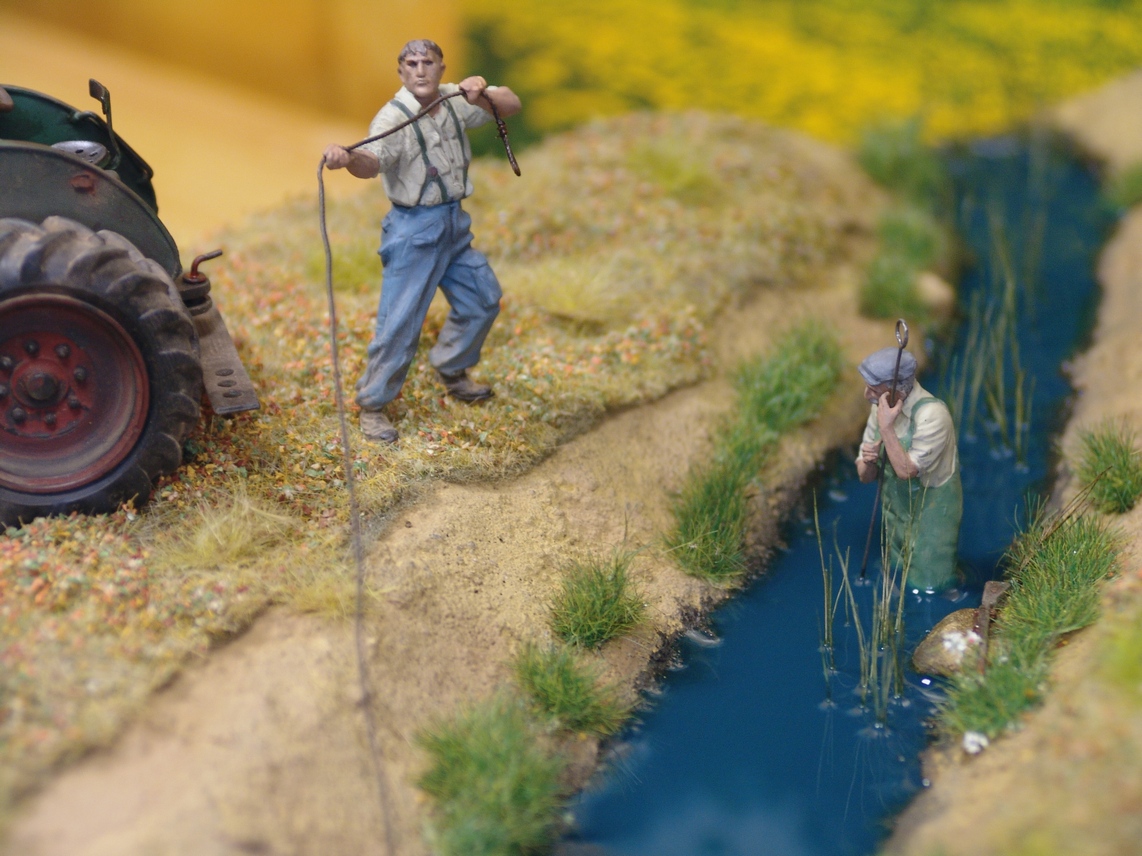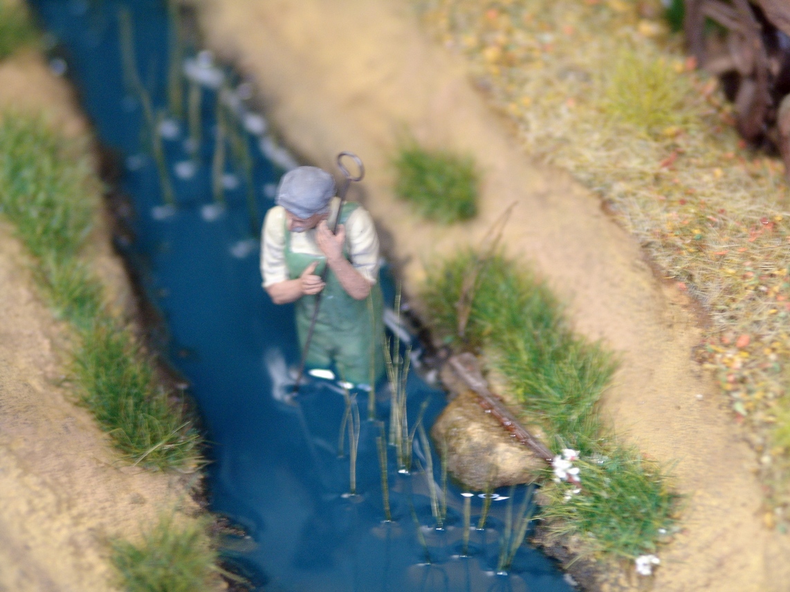 - по поводу воды поясню, это не речка и не ручей! это дренажная канава, которых во Франции, Бельгии и т.д. полно, вода в них вообще черная и соверщенно непрозрачная, как битум. Поэтому прозрачность и не планировалась изначально. По цвету черный цвет на дио вообще не подошел, серый тоже не лег, пришлось добавить немного лазоревого, тем более в солнечный день в такой стоячей воде хорошо отражается синее небо