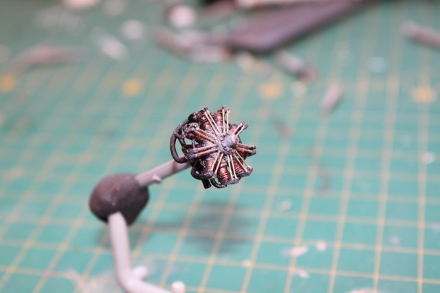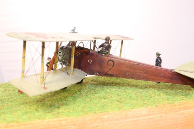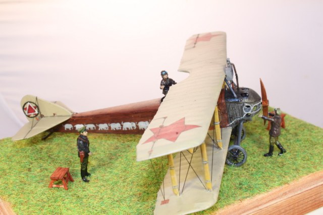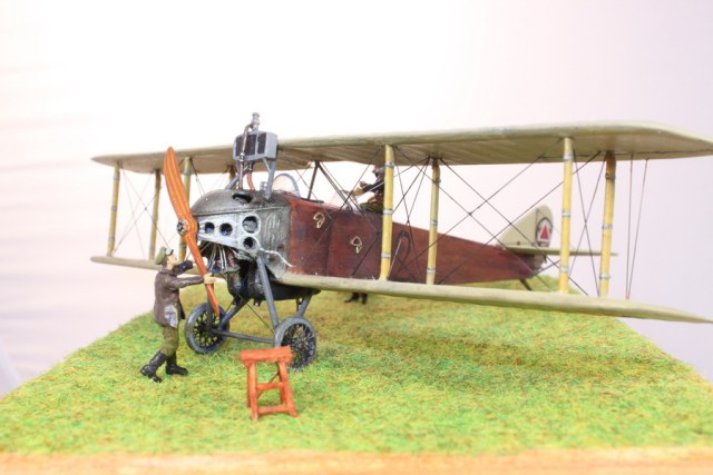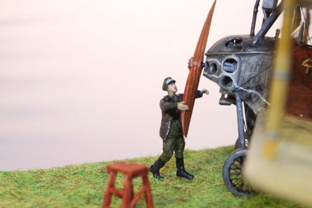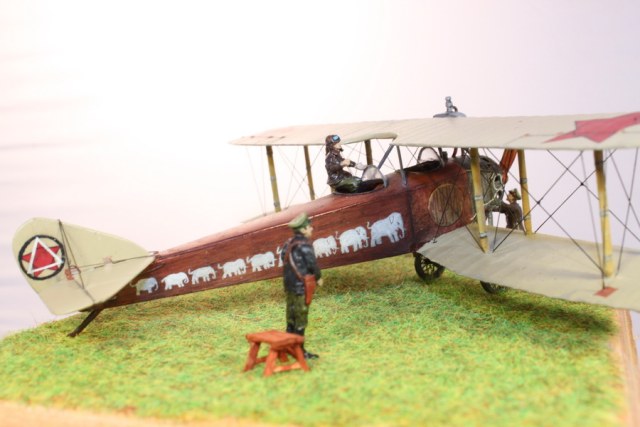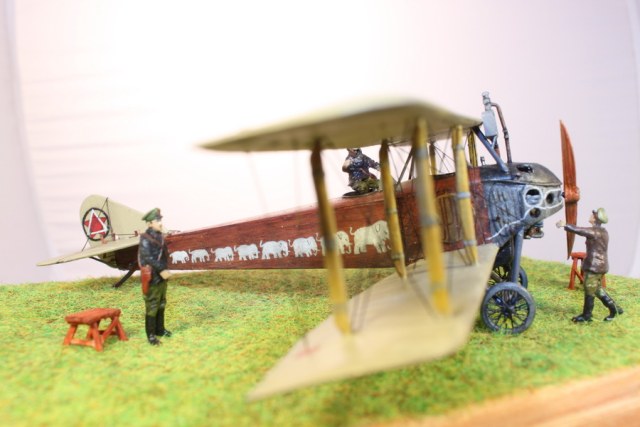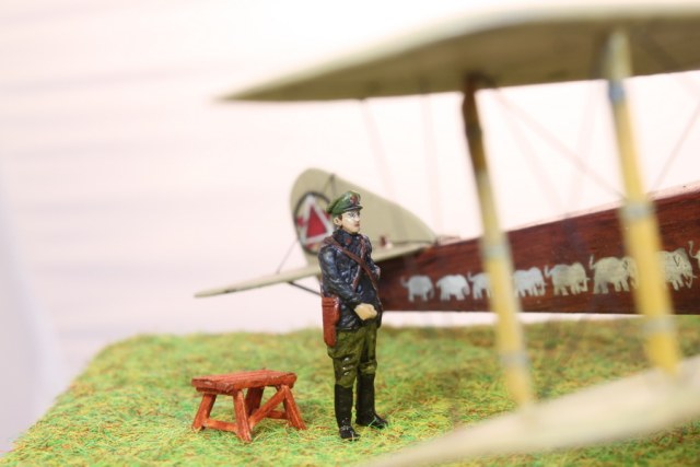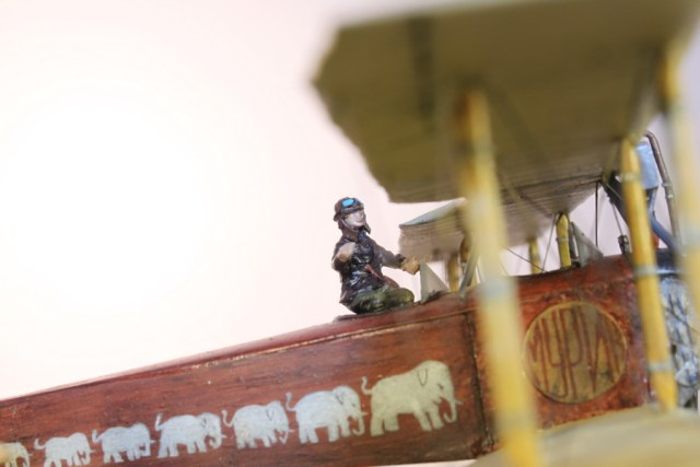 В связи с этим пришлось много пилить, тем более что и набор исходный - гнусные древние дрова годов 70-х. С нуля сделан движок, полностью переделан капот, доведены до ума крылья и оперение. Стойки из дерева, спицованные колеса - травление от Эдуарда. Звезды распечатывал сам на декальной бумаге, слонов и цифру рисовал кистью от руки. Фигурки от Armory.