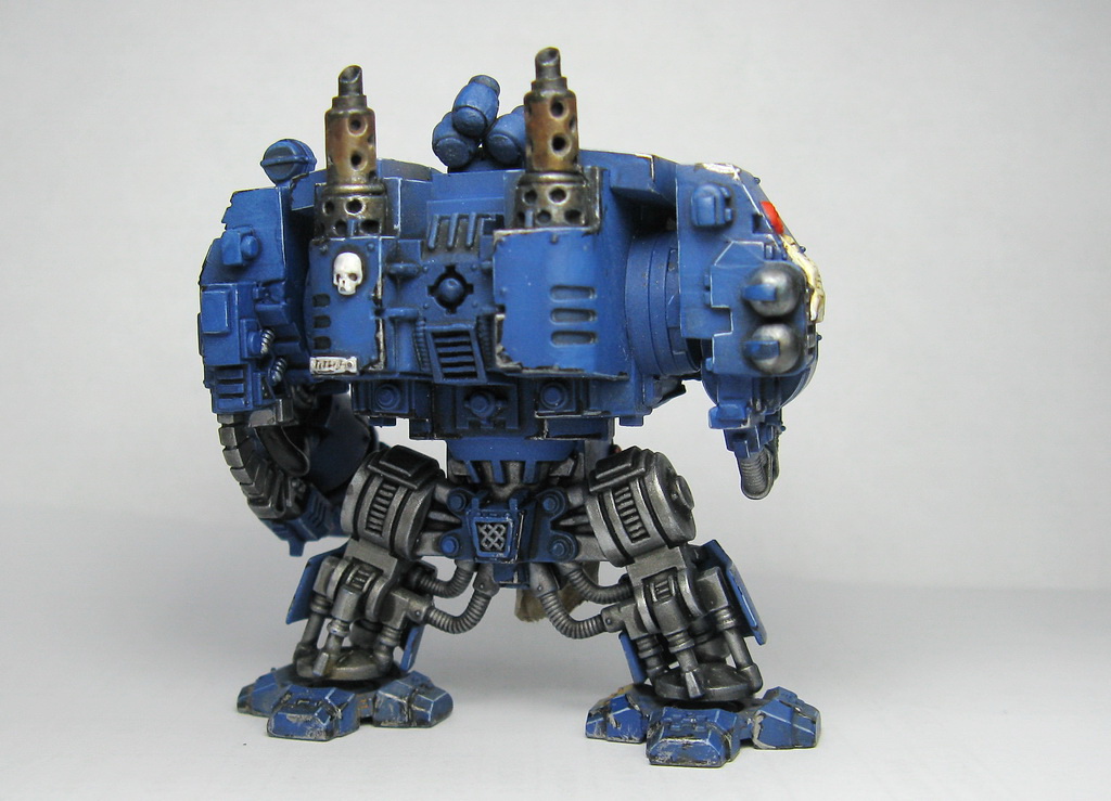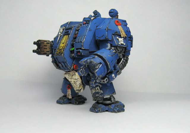 Данный дред это миниатюра и стартерного набора "Битва за Черный Предел" (упрощенная сборка и фиксированный набор вооружения. Доработок сделано минимум - глушители, дымовые гранатометы, стволы у мельты, несколько печатей и манускрипт.