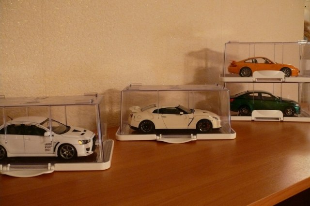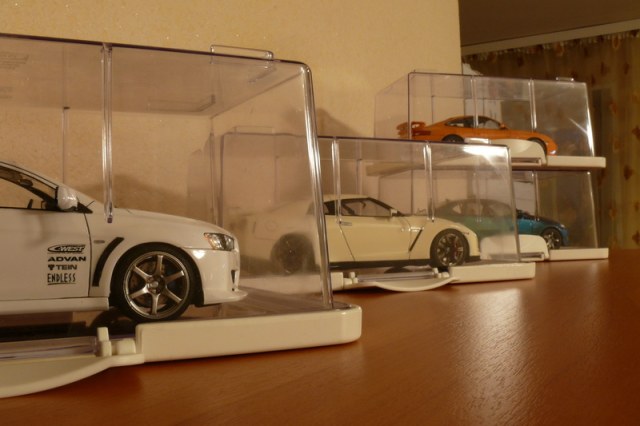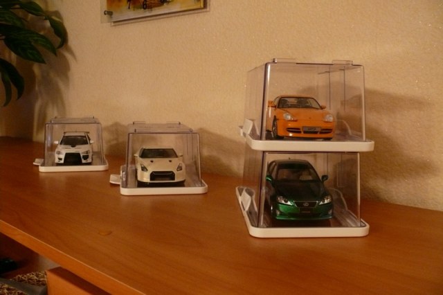 В общем, я уже привык и вполне доволен. Стоят на полке и радуют глаз. Защищают от пыли, гости спокойно рассматривают. Без проблем можно отделить кейс от крышки и посмотреть в живую. Еще как вариант, можно купить парочку нормальных кейсов от Тамии в японском магазине. Цена вопроса около 500 руб против 2500-3000 руб. в наших магазинах.