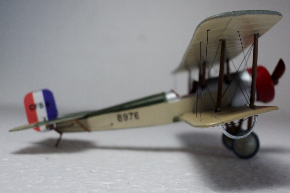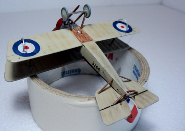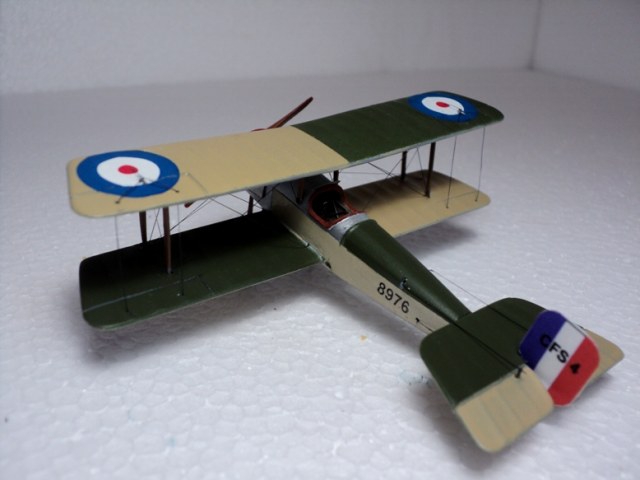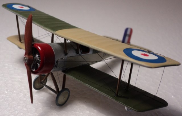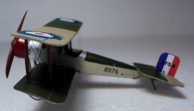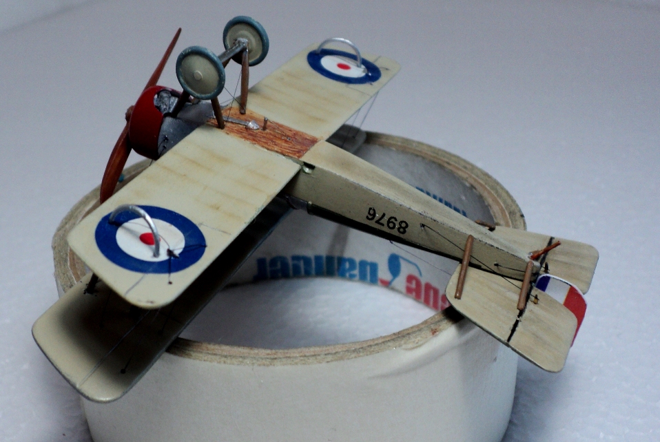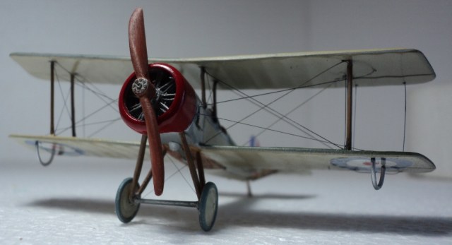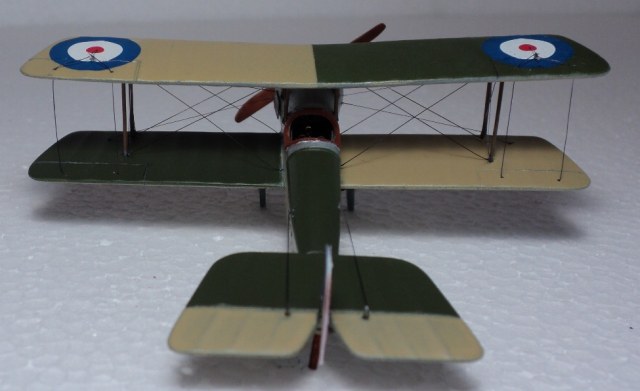Понравилась окраска (кстати, несимметричную окраску низа англичане применяли и во второй мировой). К сожалению, не только кромки крыльев выглядят слишком толстыми, но и стойки, подкосы, полуобручи, предотвращающие задевание концов крыльев о землю. Мотор, мягко говоря, не впечатляет.