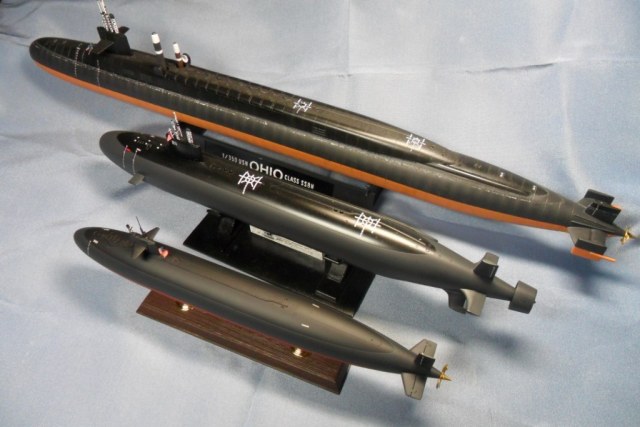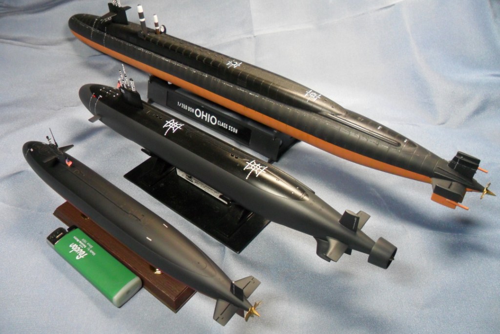 Очень хотелось сравнить модель ПЛ Трешер с лодками более поздних построек США. На последних фотографиях можно увидеть разницу в размерах между субмаринами Ohio, Seawolf и Thresher. Все представленные модели , кроме зажигалки, выполнены в масштабе 1:350.
