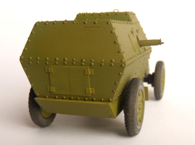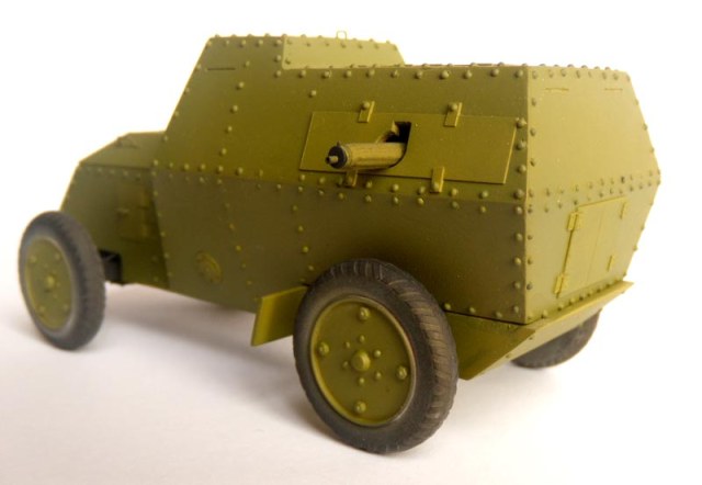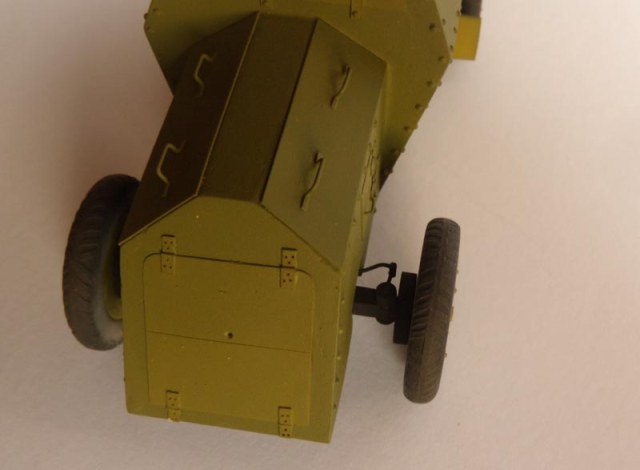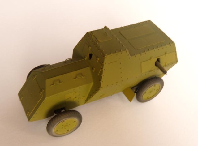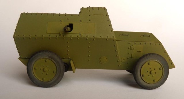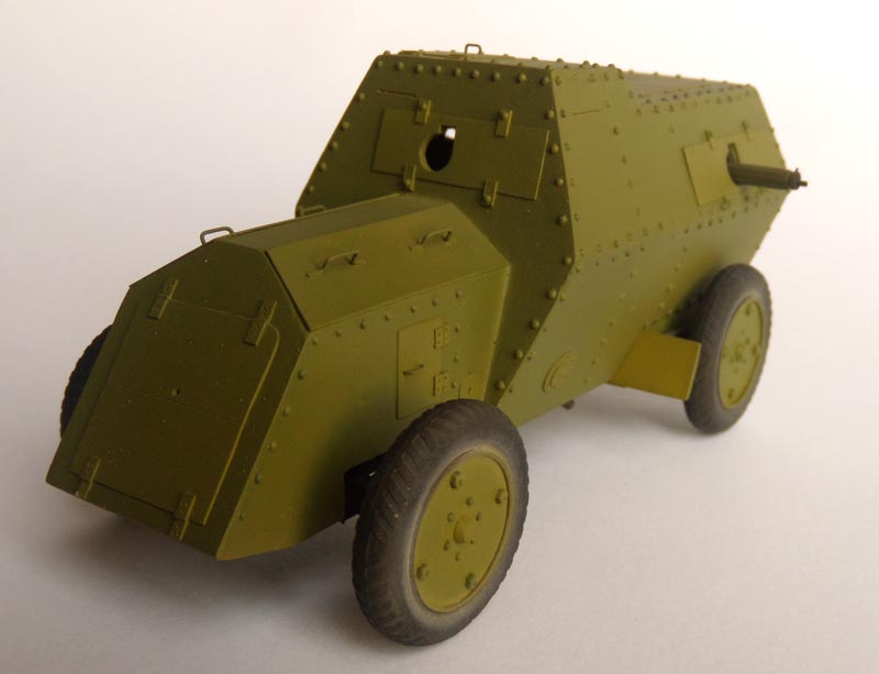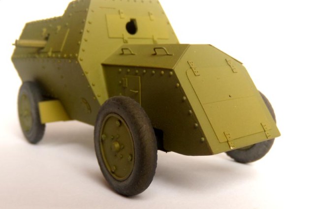 Модель я строил из картона (бронекорпус). С тонким полистиролом тогда было напряжно - все собирали внутренности от выброшенных холодильников. Картон покрывал лаком а сверху шпаклевал нитрошпаклевкой. Заклепки - от того же "Танкомастера" в пакетиках. Колеса вытачивал на электродрели, протектор наклеивал из полосок бумаги и пропитывал циакрином (тогда он только появился). Пулеметы Максим - стержень от шариковой ручки обвернутый фольгой с выдавленной гофрой.