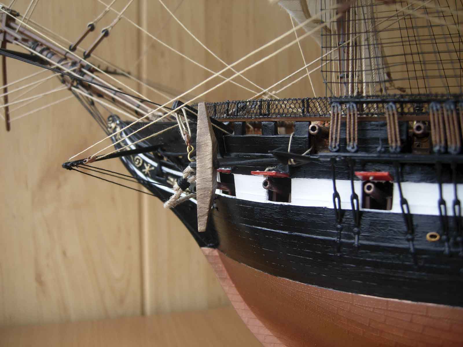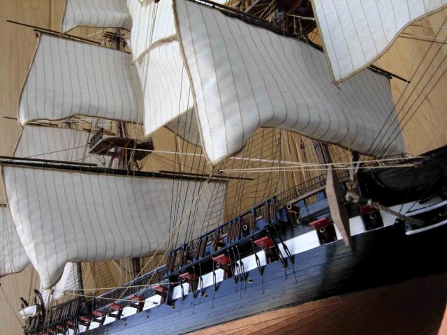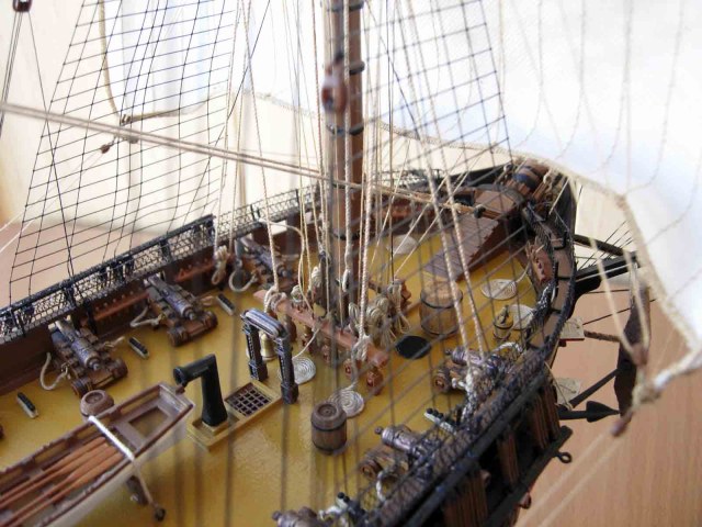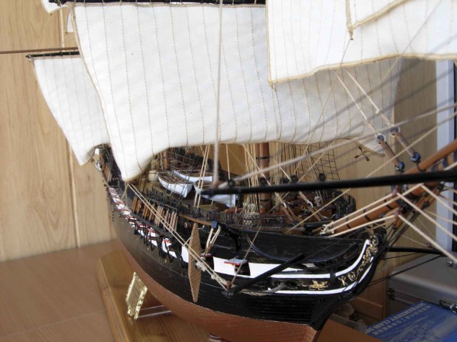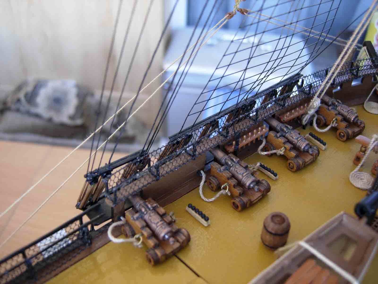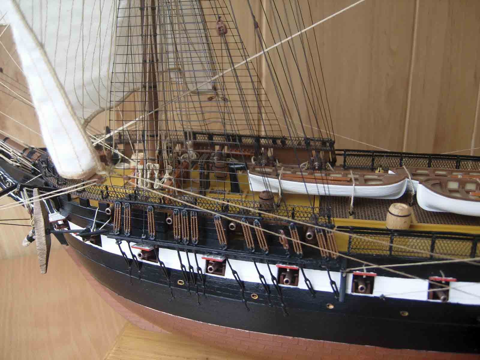 Полностью согласен, отступлений от оригинала (у меня 150 фото оригинала) очень много! Причём есть более существенные чем толщина и цвет такелажа! - например цвет мачт и внутренней стороны борта. Да, пушки абсолютно не его! - просто были куплены красивые и подходящего размера, а также ядра для них подходящего(примерно) диаметра.