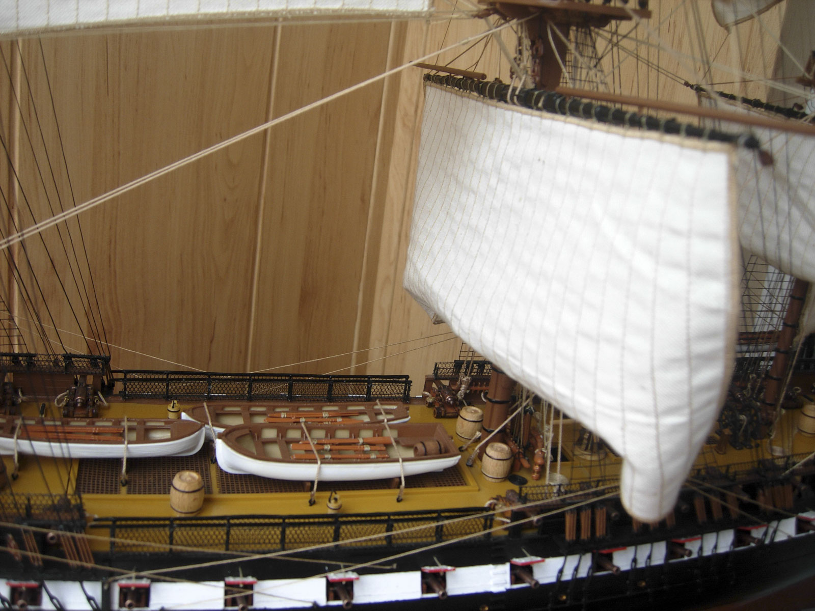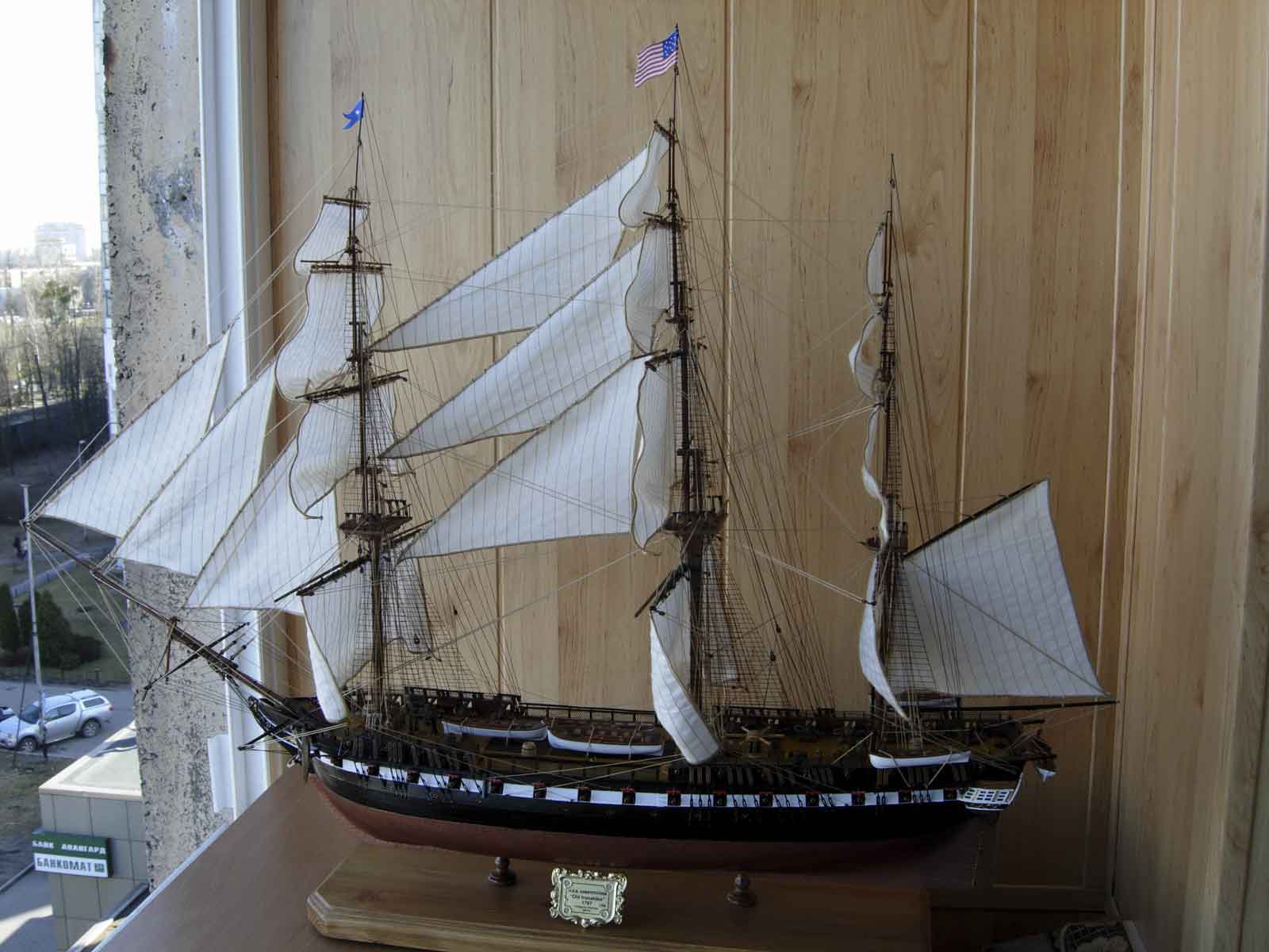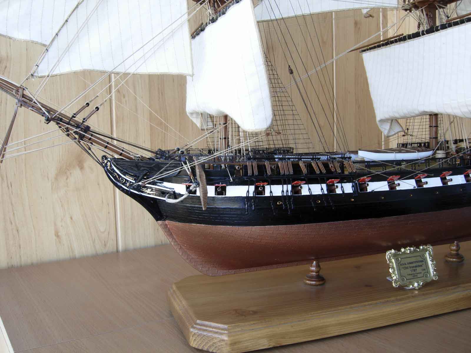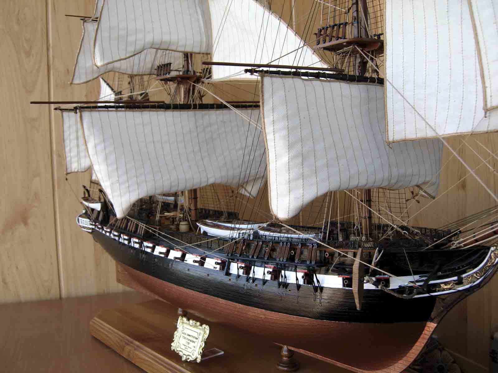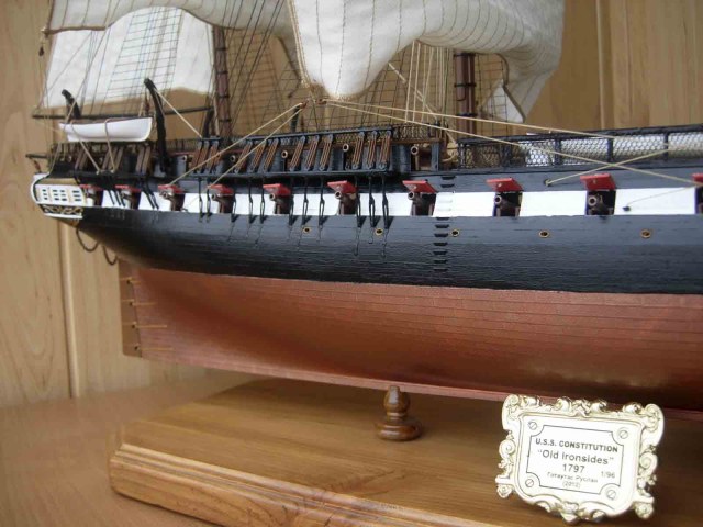 Всегда мне жалко,когда потрачено столько усилий и стараний и....куча досадных ,нет не косячков,а серьезных ошибок.К кому их отнести?К изготовителю набора /т.е. к Ревеллу,будь он неладен/ или к моделисту?Итак: ванты и штаги безумно тонкие.Нити талрепа между юферсами толще вант,бегучий такелаж /тем более белый/ толще стоячего такелажа.Дальше- на палубе Конституции стояли не пушки,а карронады.И даже если отнести сей косяк к изготовителю,то брюк не вязался к кольцам,а охватывал вингард/англ.вариант/или проходил сквозь лафет/французский/.Паруса...Ну хотя бы на нижних надо было сделать риф-банты.Масштаб-то серьезный.Палуба никакая.Такое впечатление,что даже не покрашена.Про расшивку даже упоминания нет.И блеск везде....