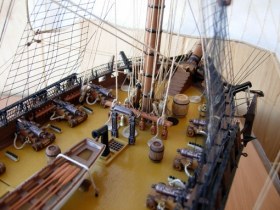 Модель собирал на подарок человеку давно мечтавшему о паруснике, поэтому пришлось раскрутиться на массу дополнений – пушки, ядра, паруса, якоря, нити, «палубные мелочи» и т.п. Делал долго (по мере возможности, свободного времени), не спеша, получая удовольствие (даже от такелажа, хотя мороки…. ). Конечно не без «косячков», но в общем я остался доволен, а получивший его человек искренне радовался подарку – это лучшее признание.