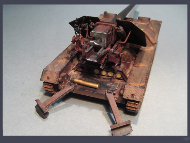 "..модель из серии «Panzerwaffe 46″, колоссальный противотанковый самоходный лафет со 128-мм орудием. Машина разрабатывалась в конце войны, но не вышла за пределы чертежной доски."