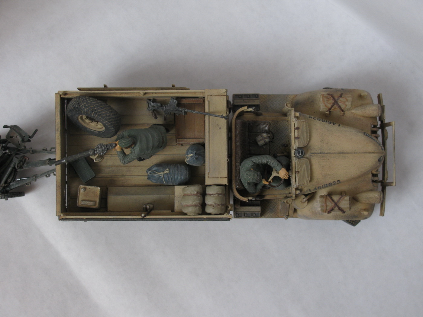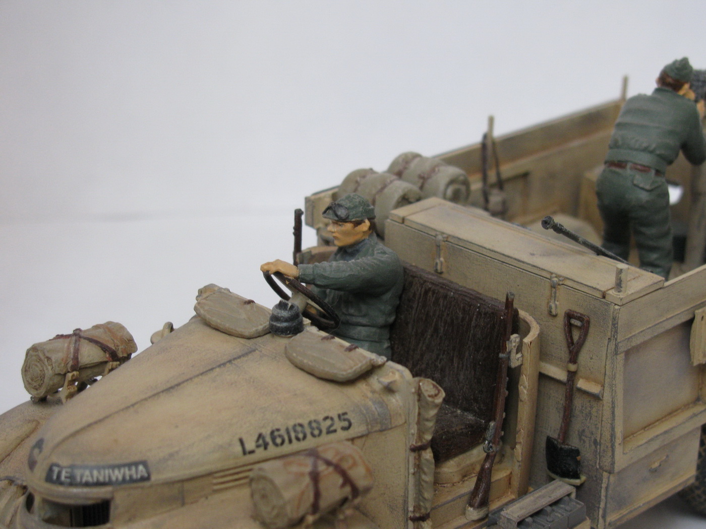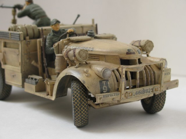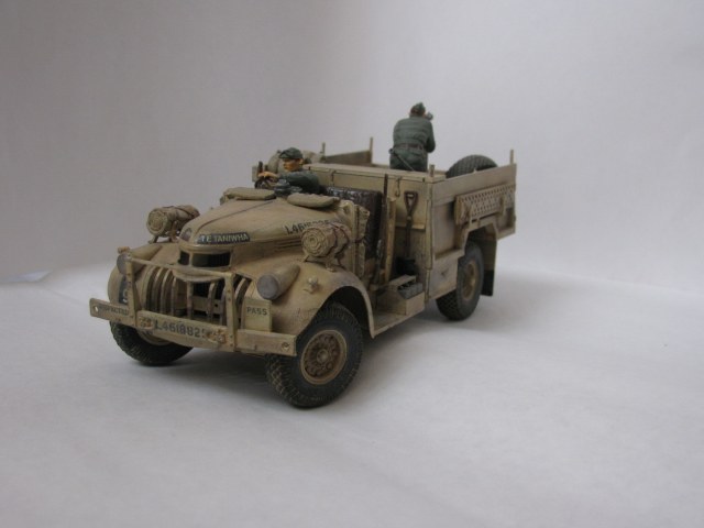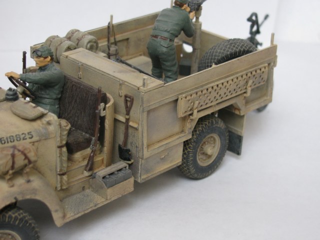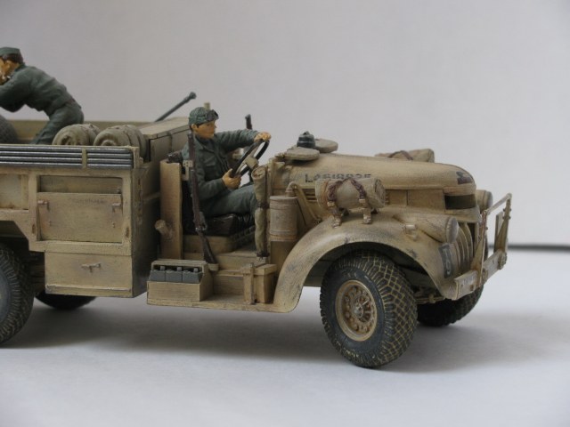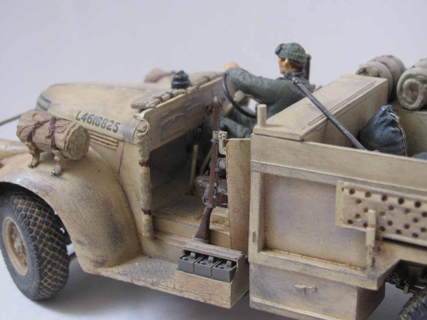 Модель собиралась из коробки, доработок немного: ремни к флягам, очки водителя, фары. Окрашивал кистью - акрил Revell, смывка - маслом, сухая кисть, пастель. Фигурки вообще впервые делал. Принимаю критику и дельные советы.
