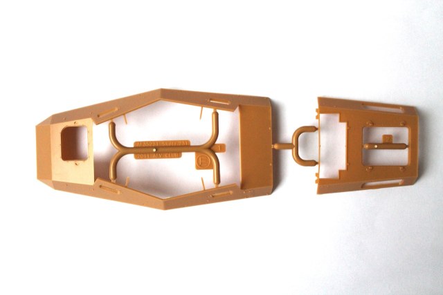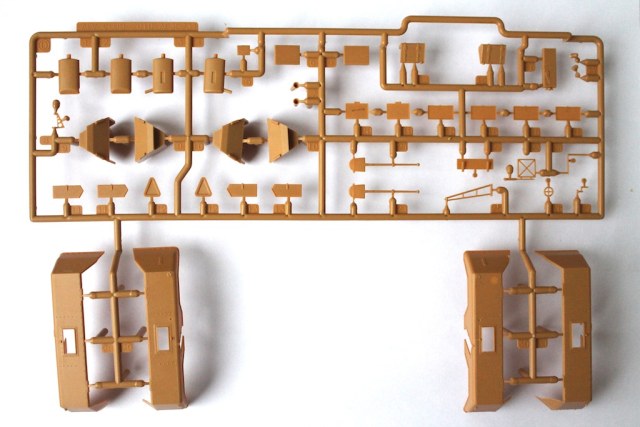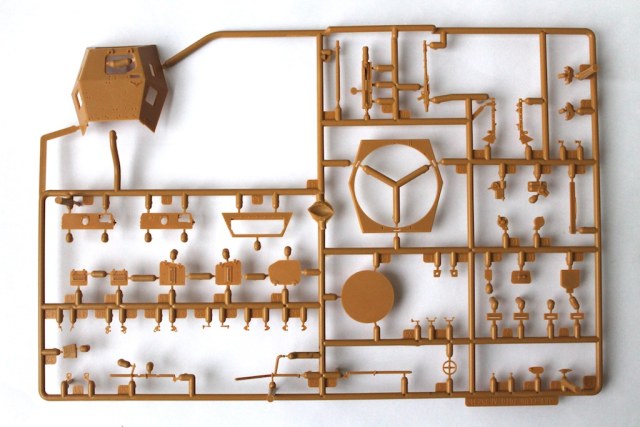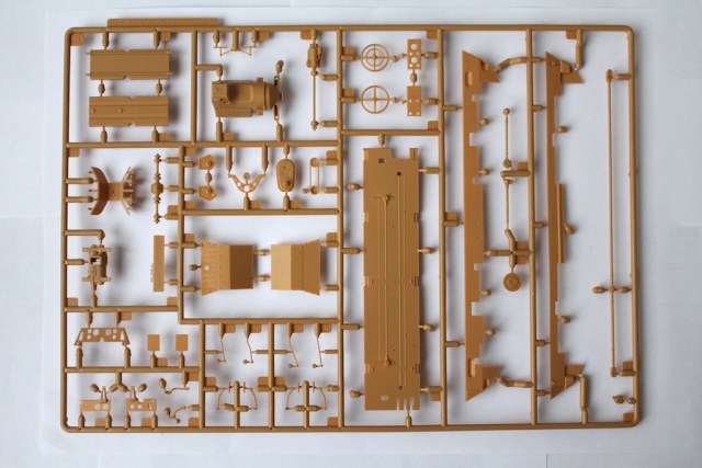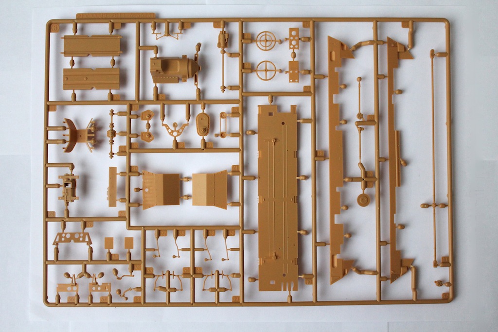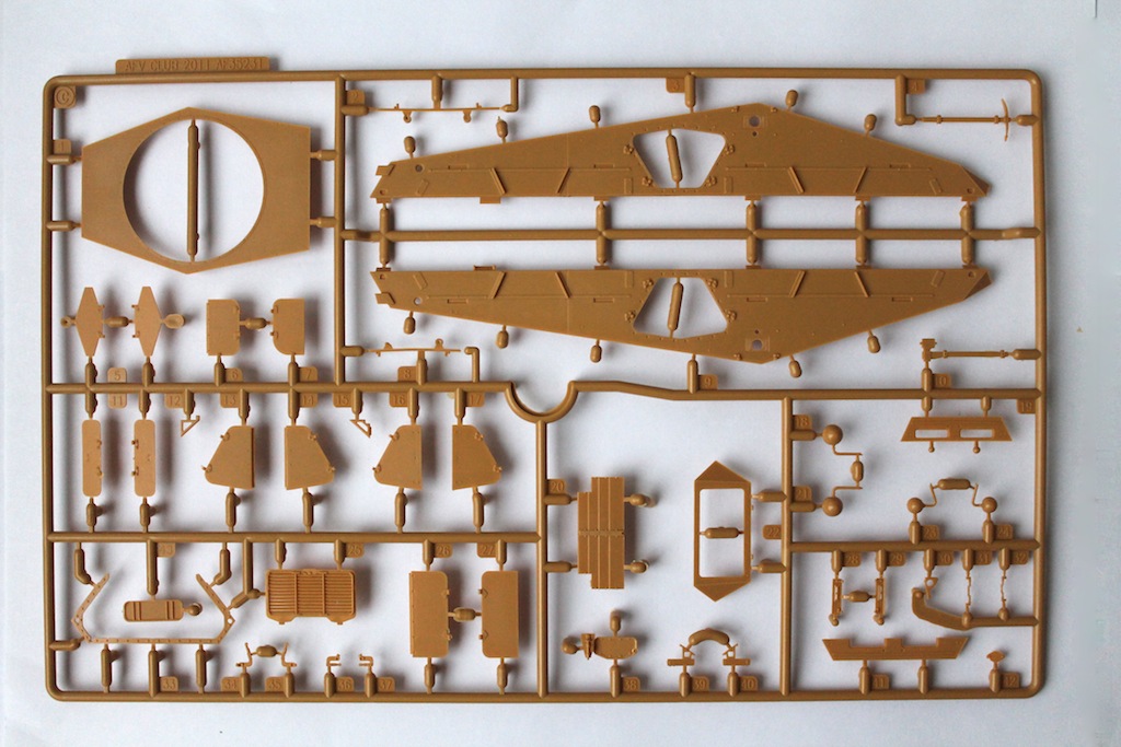 Пять литников из мягкого пластика. Имеется облой. Покрышки виниловые, придется покупать пластик или смолу. Очень подробный интерьер. Маленькая плата фототравления. Инструкция "книжечкой". На дне коробки небольшой постер. Покупал за 1900 рублей.