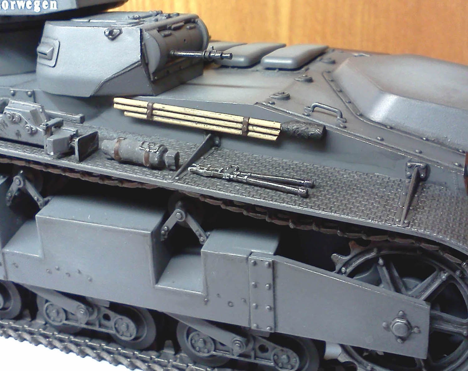 Собрано аккуратно. А вот покрасить можно было и поинтересней, та же ржавчина на глушителях по своей природе неоднородна, траки посильней оттонировать, смывку поконтрастней (почти не видно) и т.д. И, не понятно, какого он цвета на самом деле? На фото заметил как минимум три варианта: от серо-голубого до серого.
