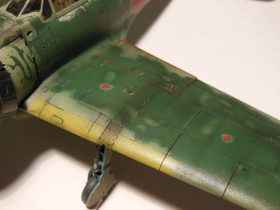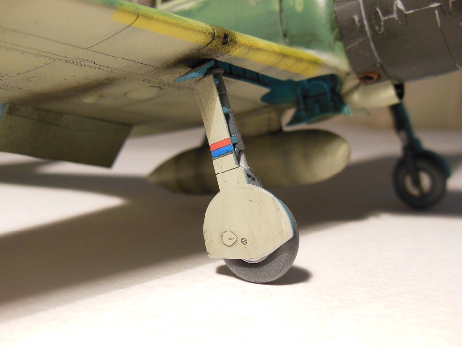 Бросилось в глаза потертость до грунта (обшивка в районе кабины), мазки сине-зеленого (в районе обшивки возле ниш) и не соответствие по цвету "Кидаидаи" (полоса быстрой идентификации на передней кромке крыла FS 33432 должна быть ближе к оранжевому).