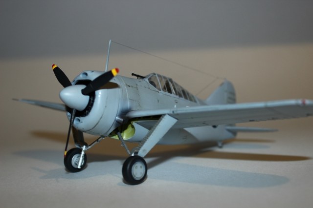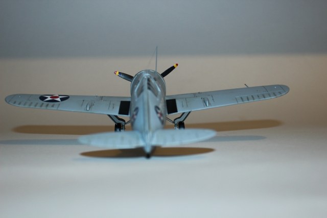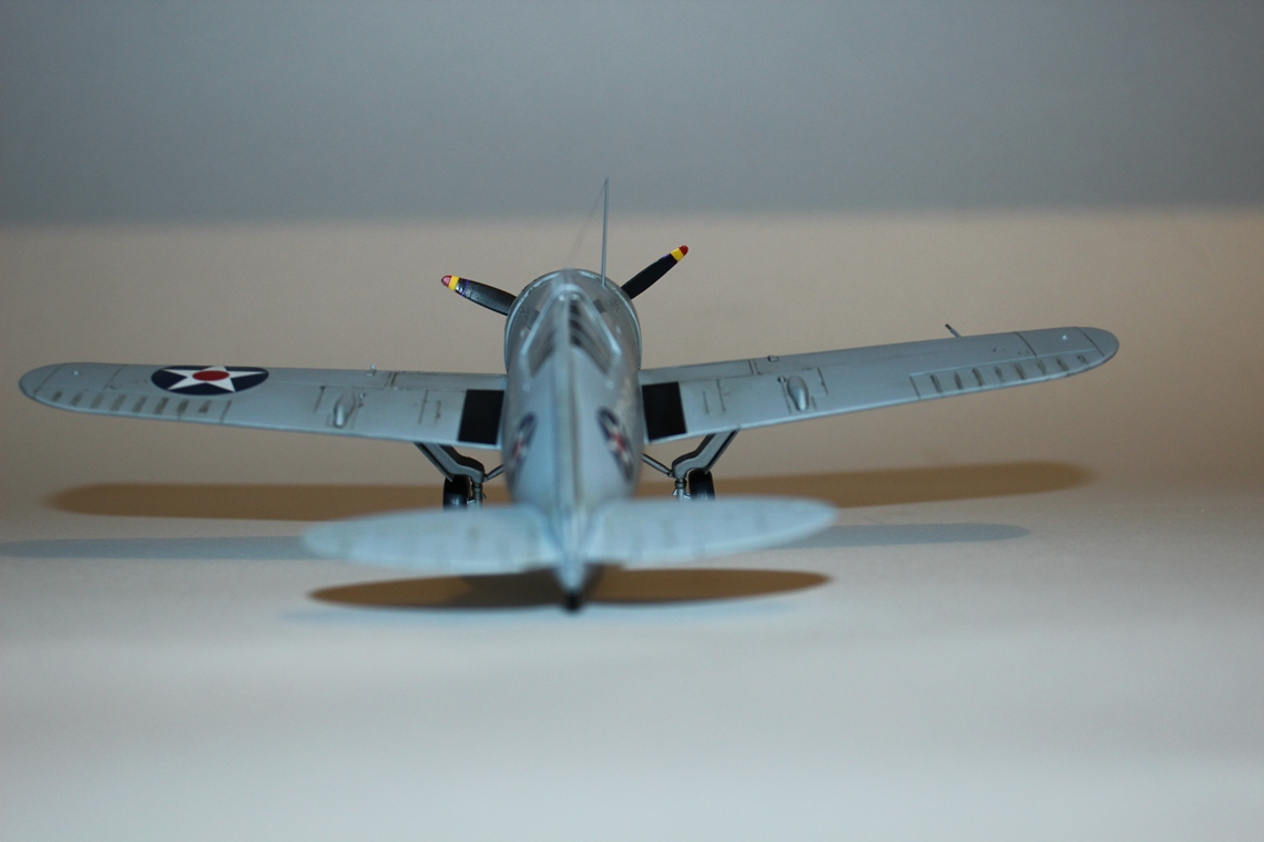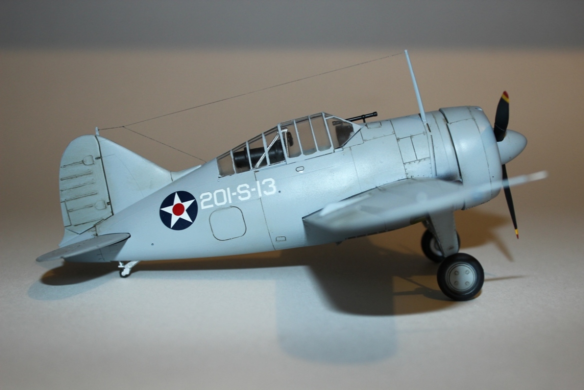 Давно хотел получить в коллекцию «американца», а потому в качестве прототипа выбрал предлагаемый вариант F2A-2 с борта авианосца «LongIsland». Самолет полностью окрашен аэрографом в цвет FS: 36375 «LightGhostGray» из палитры водоразбавляемого АКАНа. Ниши шасси и внутренние поверхности окрашены «ChromateYellow», стойки шасси – X-11 «ChromeSilver» от «TAMIYA». Для выделения расшивки использовал художественную акварель цвета «умбра»+фэйри. В сети удалось найти фотографию борта 201-S-13, рассмотрев которую, решил самолет сильно не обдирать и не пачкать. Ограничился лишь небольшим количество сколов, наносил которые кисточкой металликом от «Vallejo» и нагаром на фюзеляже в районе выхлопных патрубков. Декали наносил при помощи раствора «MarkFit» от «Тамии». Сверху модель покрыта полуглянцевым лаком АКАН.