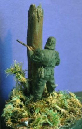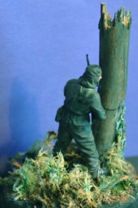 Теперь о фигурке. Фигурка из набора "Советские Разведчики" производства "Звезды". Была заменена рука (из того же набора) и голова (Dragon). Окрашена темперой "Мастер Класс". Камуфляж я рисовал впервые. Опирался на статью В.Демченко, за которую большое спасибо.